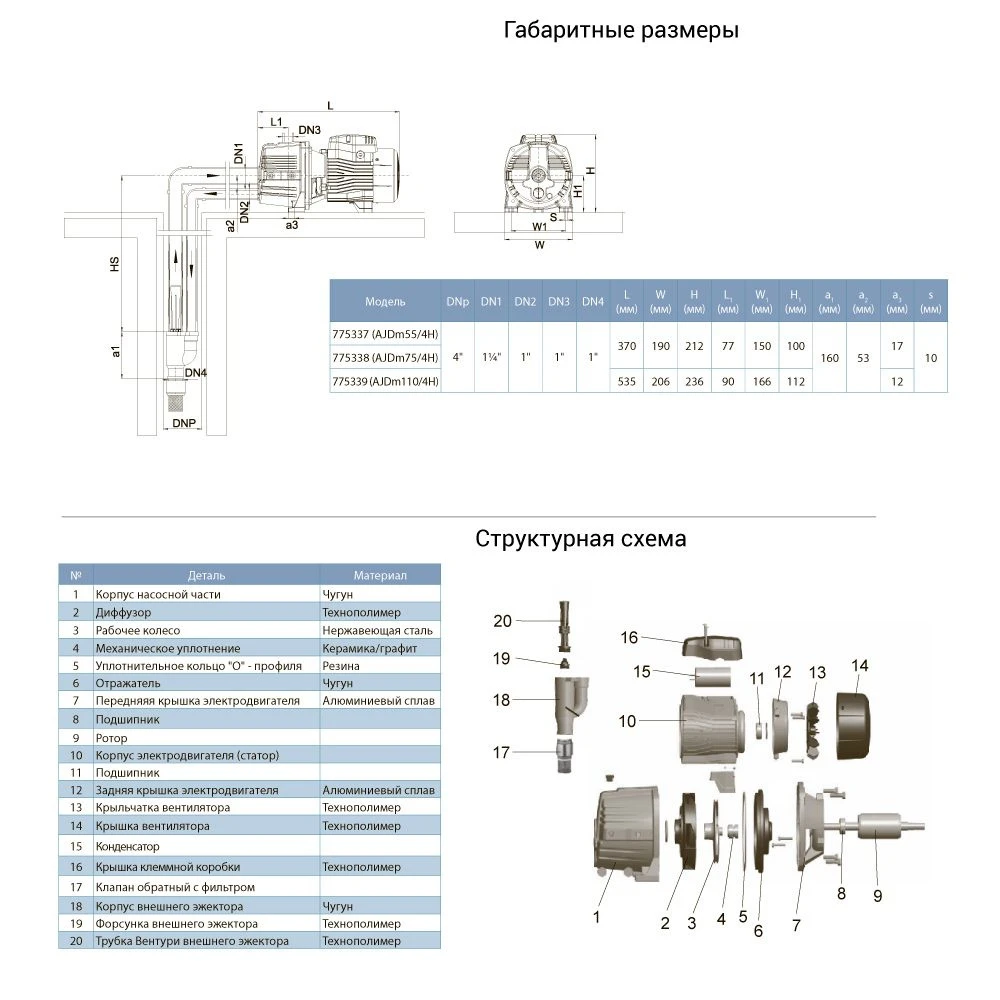 Насос відцентровий з зовнішнім ежектором 0.75кВт HSmax 35м Hmax 50м Qmax 30л/хв (зовнішній ежектор Ø96мм) LEO 3.0 AJDm75/4H (775338)