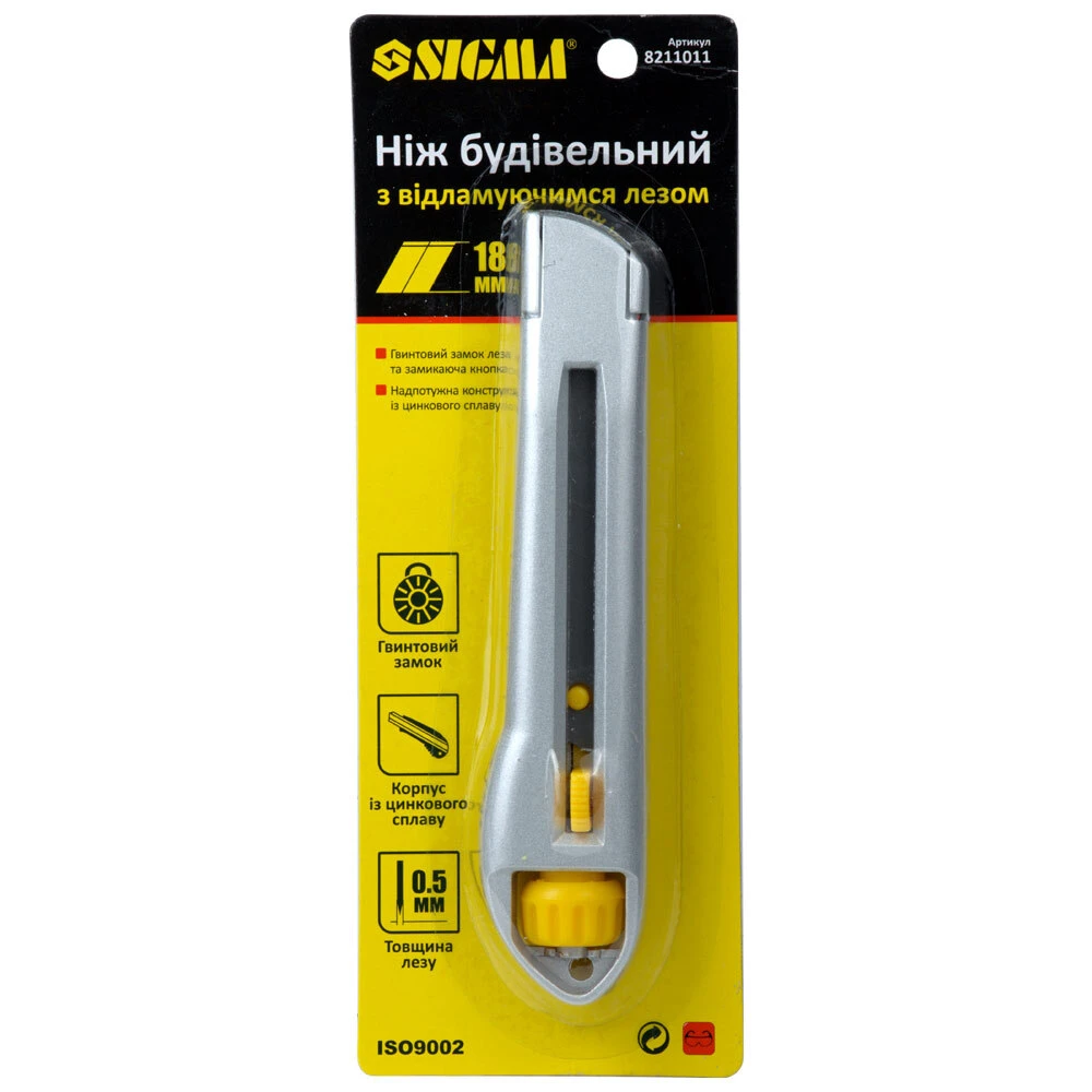 Ніж будівельний (металевий корпус) лезо 18мм гвинтовий замок SIGMA (8211011) призначений для розрізання із застосуванням значних зусиль різних матеріалів: килимових покриттів, картону, тканини, паперу.