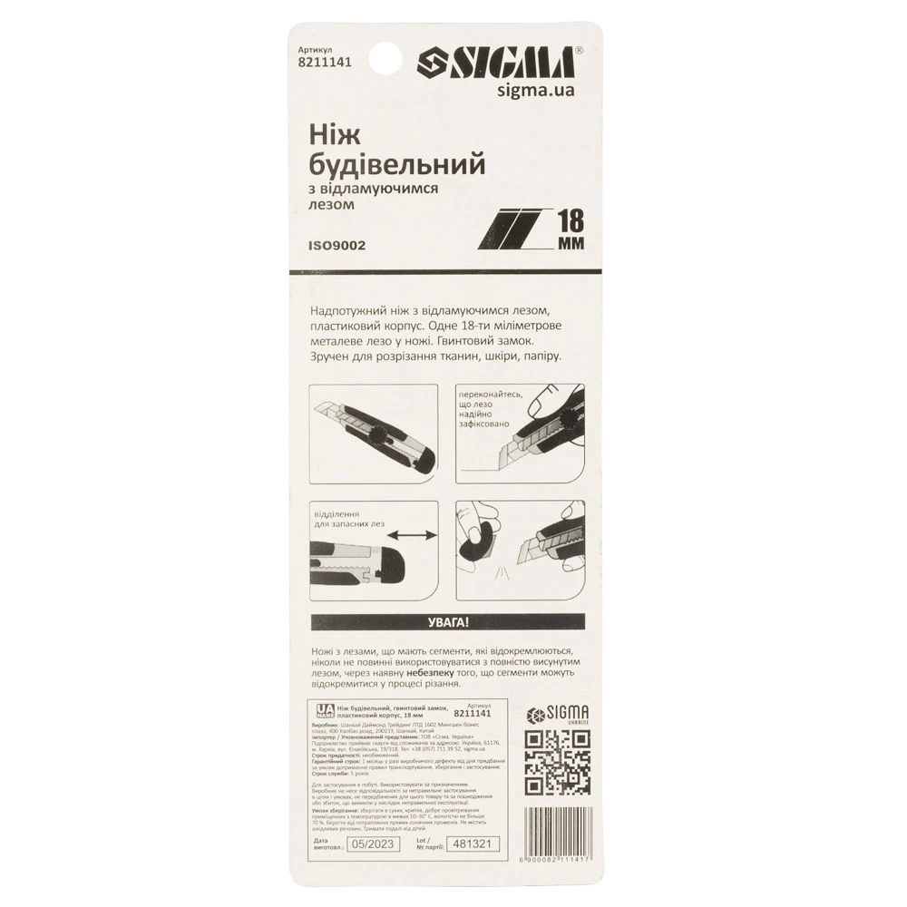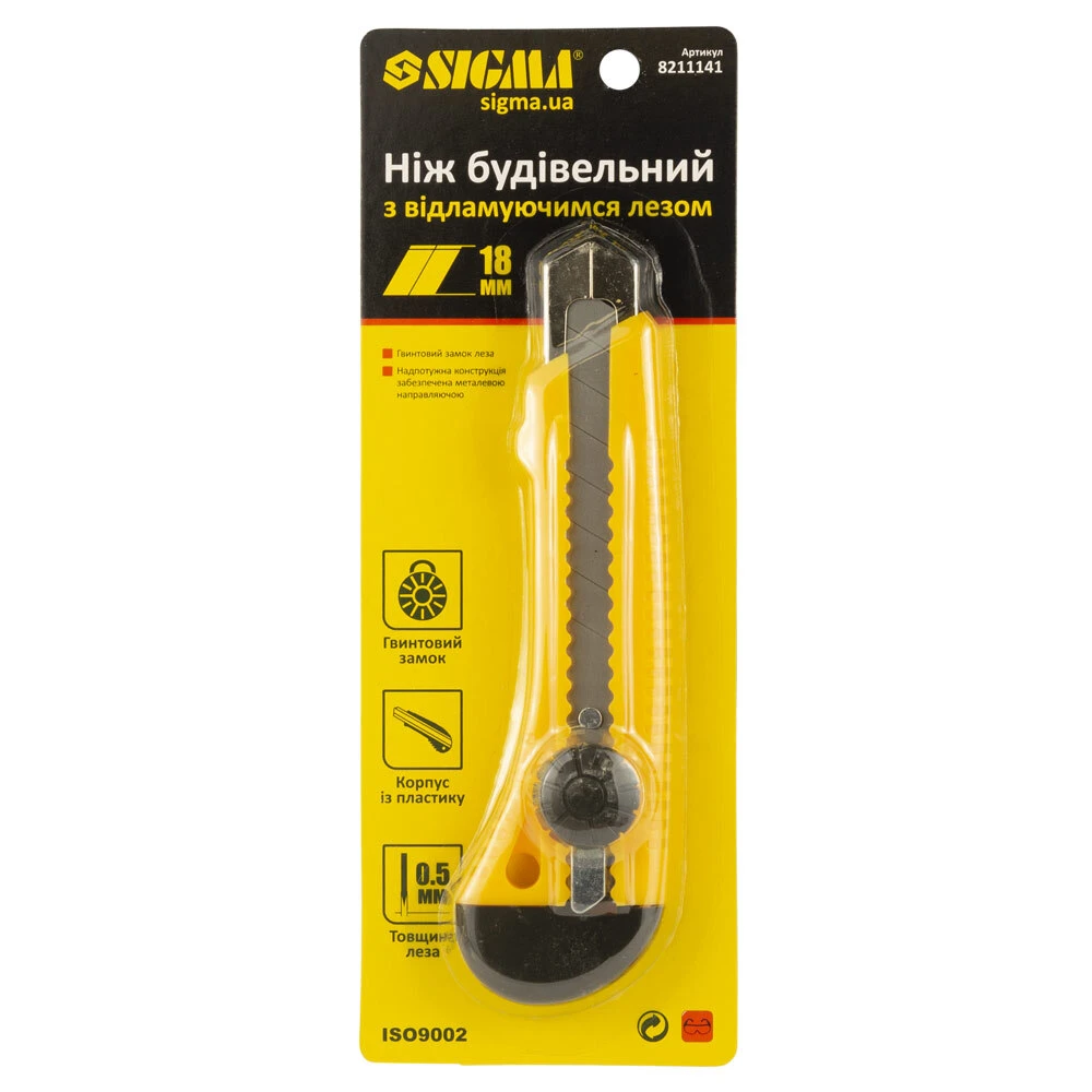 Ніж будівельний (пластиковий корпус) лезо 18мм гвинтовий замок SIGMA (8211141) призначений для розрізання із застосуванням значних зусиль різних матеріалів: килимових покриттів, картону, тканини, паперу.
