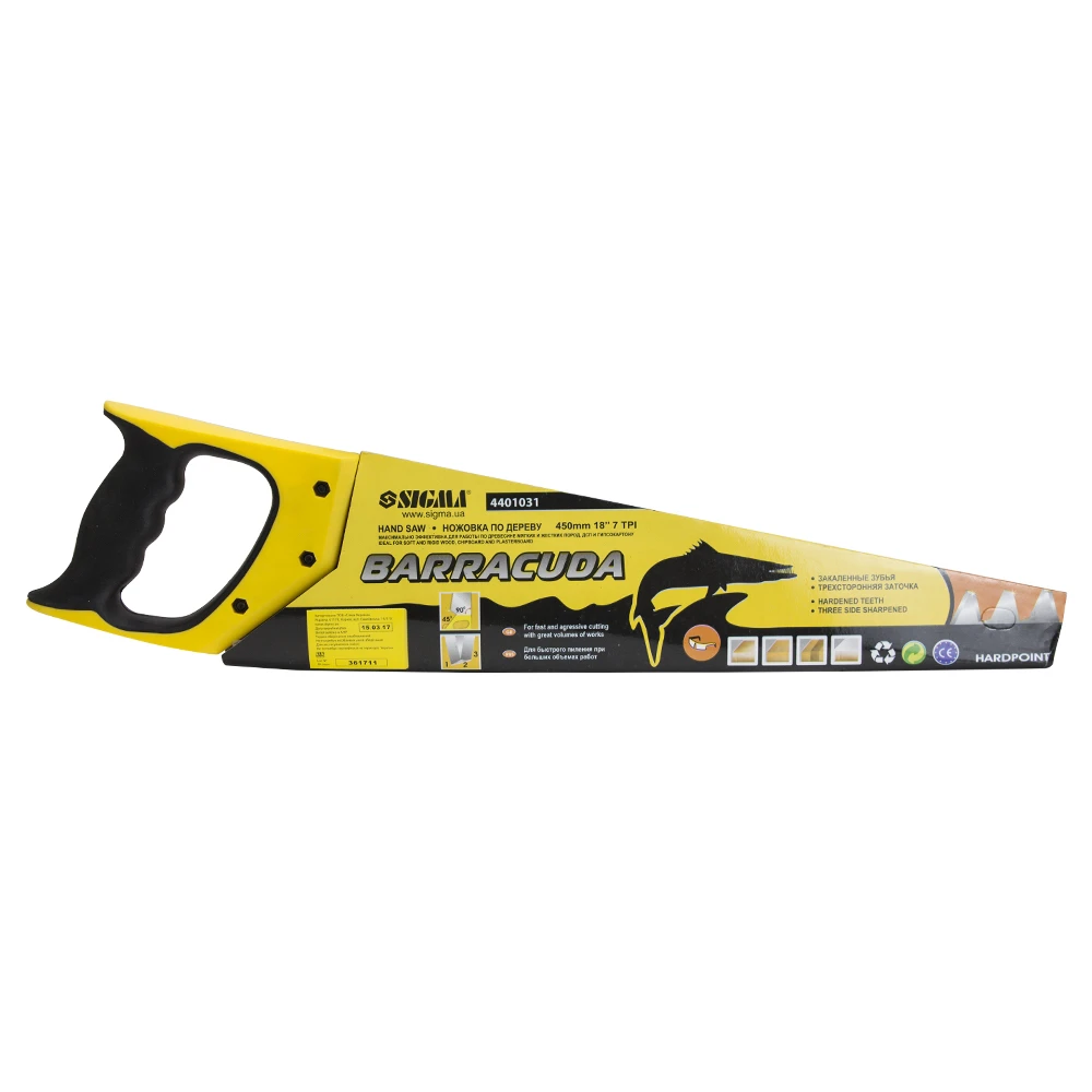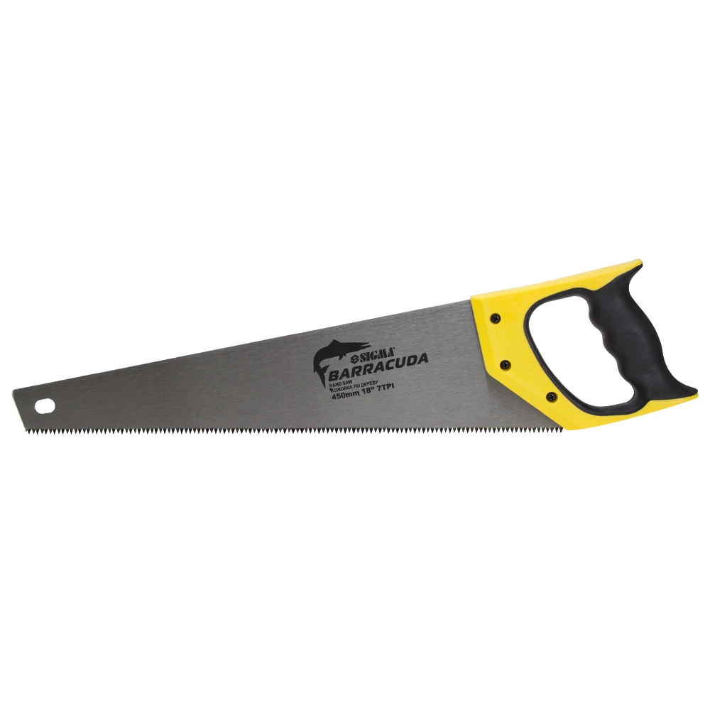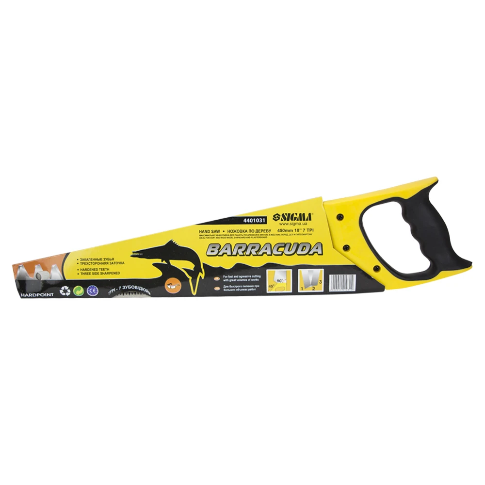 Ножівка по дереву 450мм BARRACUDA SIGMA (4401031) призначена для розпилювання заготовок середніх розмірів з деревини м'яких і твердих порід, ДСП, фанери і ПВХ. Має загартований і розведений зуб з тригранної заточкою, що дозволяє виробляти пиляння в обох напрямках. Пила оснащена предотвращающей її прослизання в руці двухкомпонентной (пластмаса + гума) рукояткою закритої форми, яка кріпиться до полотна гвинтами.