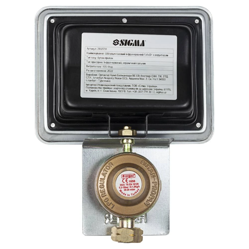 Обігрівач газовий інфрачервоний 1.4 кВт з редуктором SIGMA (2903731) призначений для обігріву невеликих приміщень, павільйонів та наметів, сушіння в малярських роботах, обігріву та сушіння в будівельних роботах. В конструкцію обігрівача вбудован редуктор. Використовується з великими газовими балонами різного об'єму оснащеними вентилями.