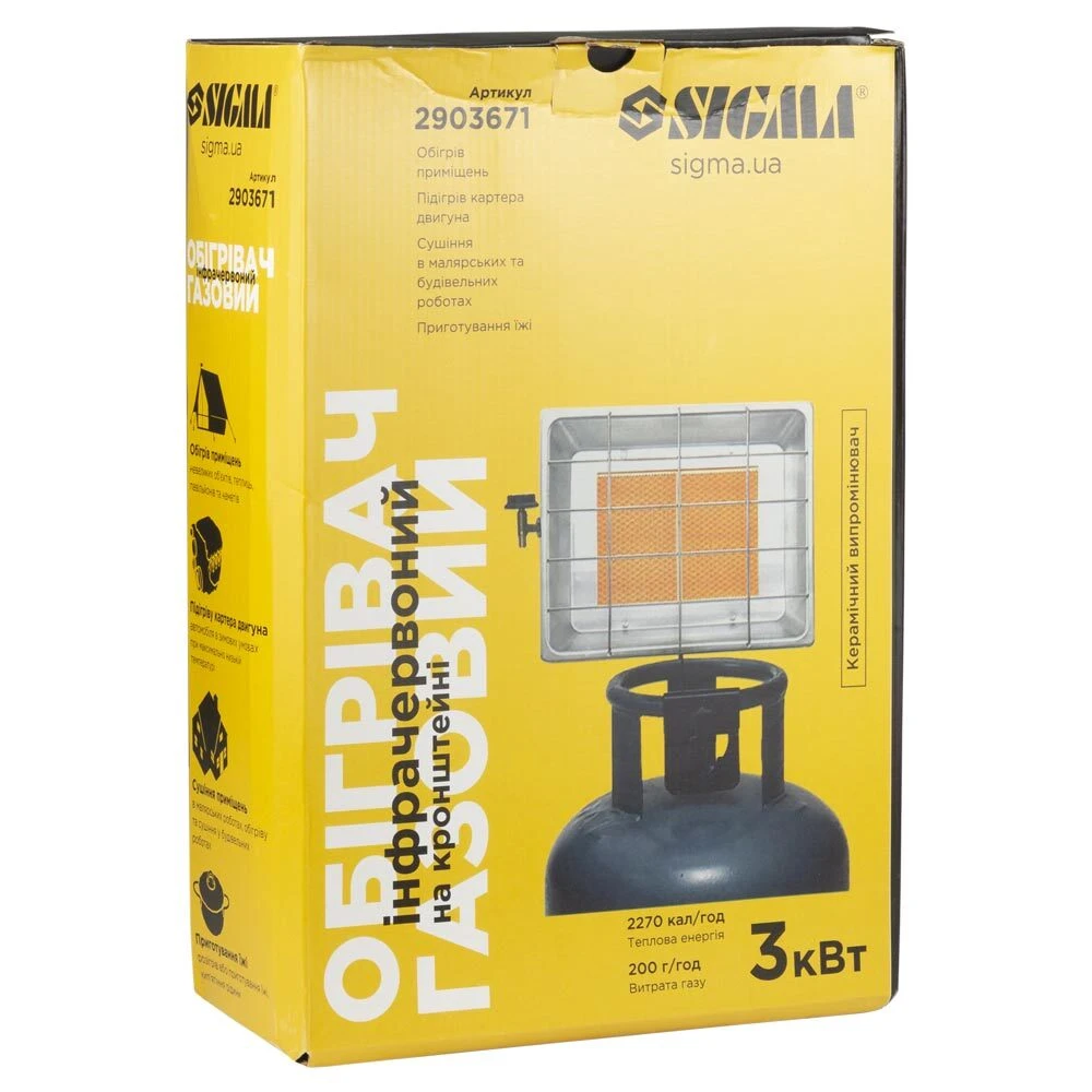 Обігрівач газовий інфрачервоний 3кВт на кронштейні SIGMA (2903671) призначений для обігріву невеликих приміщень, павільйонів та наметів. Також ідеально підходить для: