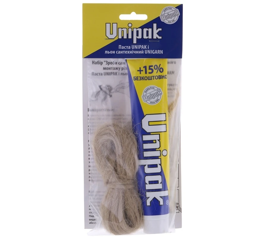 Паста UNIPAK, використана з сантехнічним льоном, забезпечує 100% гарантію герметичності різьбових з'єднань, крім того, вона дозволяє надалі легко розібрати з'єднання при необхідності. На відміну від інших герметиків для герметизації UNIPAK надає можливість регулювання різьбового з'єднання.