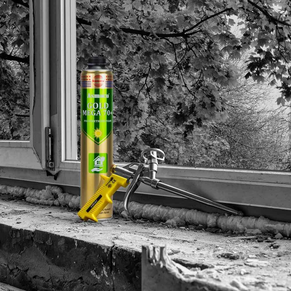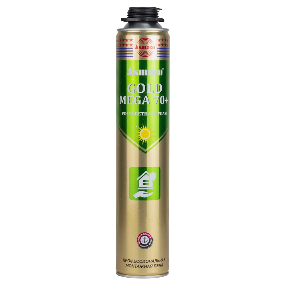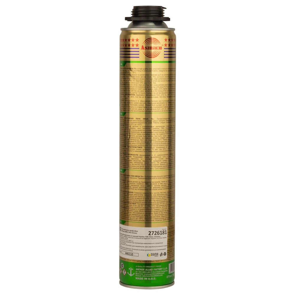 Піна монтажна професійна 870мл (1000г) ОАЕ ASMACO (2726181) призначена для побутового та професійного використання, а саме для монтажу дверей та вікон, заповнення пустот та тріщин, герметизація стиків та швів, теплоізоляція приміщень та водопровідних труб.