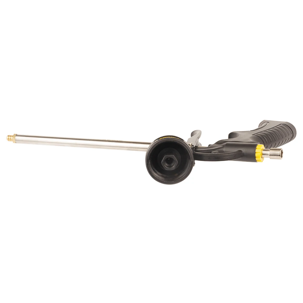 Конструкція пістолета має адаптер для підключення балона з піною, який розташований у верхній частині пістолета. Для запобігання витікання піни, інструмент оснащений головкою з вбудованим механізмом кульки, разом з голкою. Голка виконана з нержавіючої сталі, високої якості, а покриття забезпечує захист від корозії та тривалий термін експлуатації.