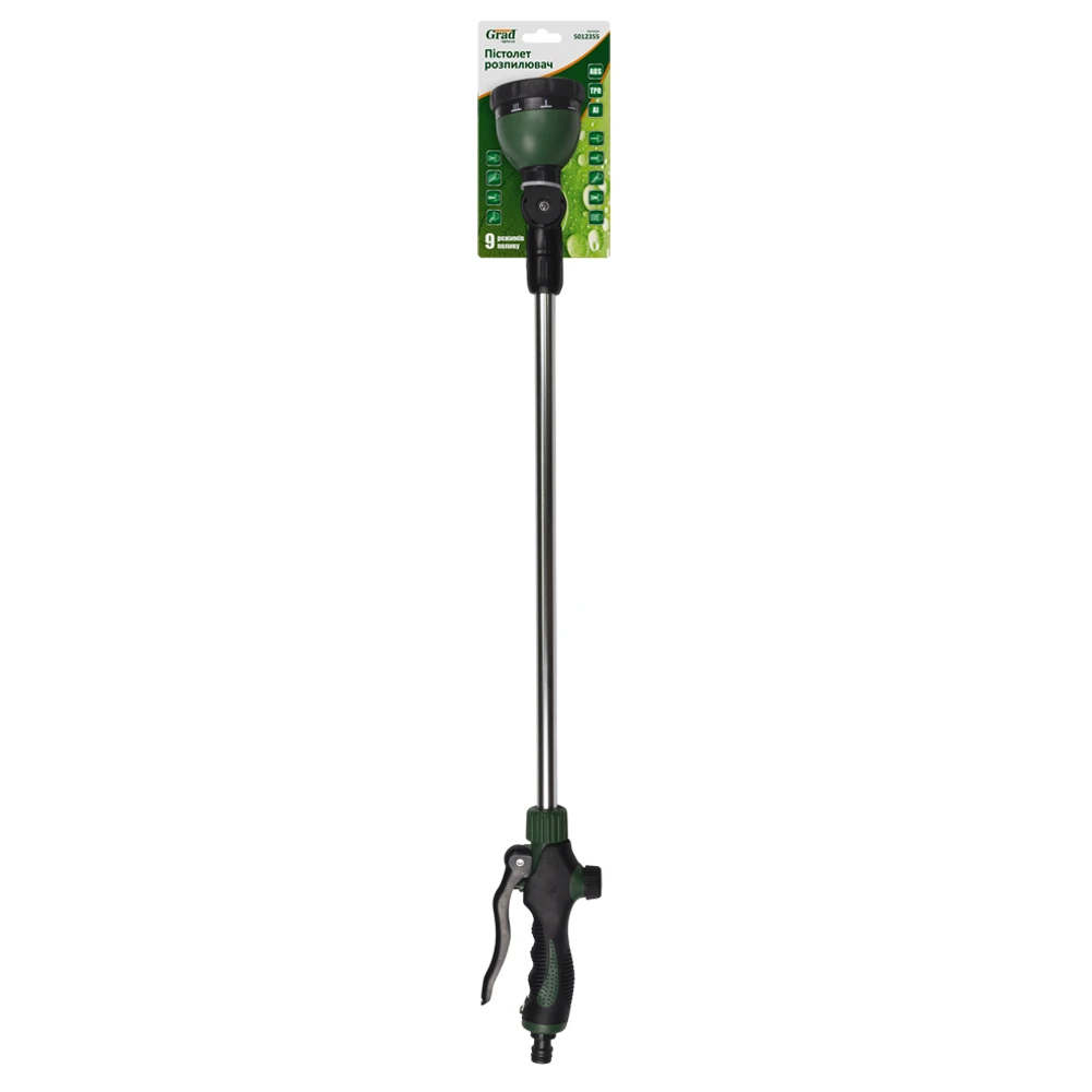 Пістолет-розпилювач 9 режимів з подовжувачем 700мм поворотний (пластиковий) GRAD (5012355) застосовується для поливу рослин, квітів і овочів в важкодоступних і віддалених місцях. Двокомпонентна рукоятка виконана з ударостійкого міцного пластику з гумовим покриттям, має поглиблення під пальці рук для зручності надійного захоплення і комфорту при роботі з інструментом.