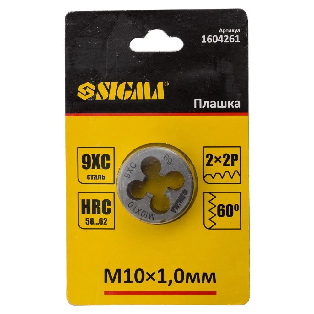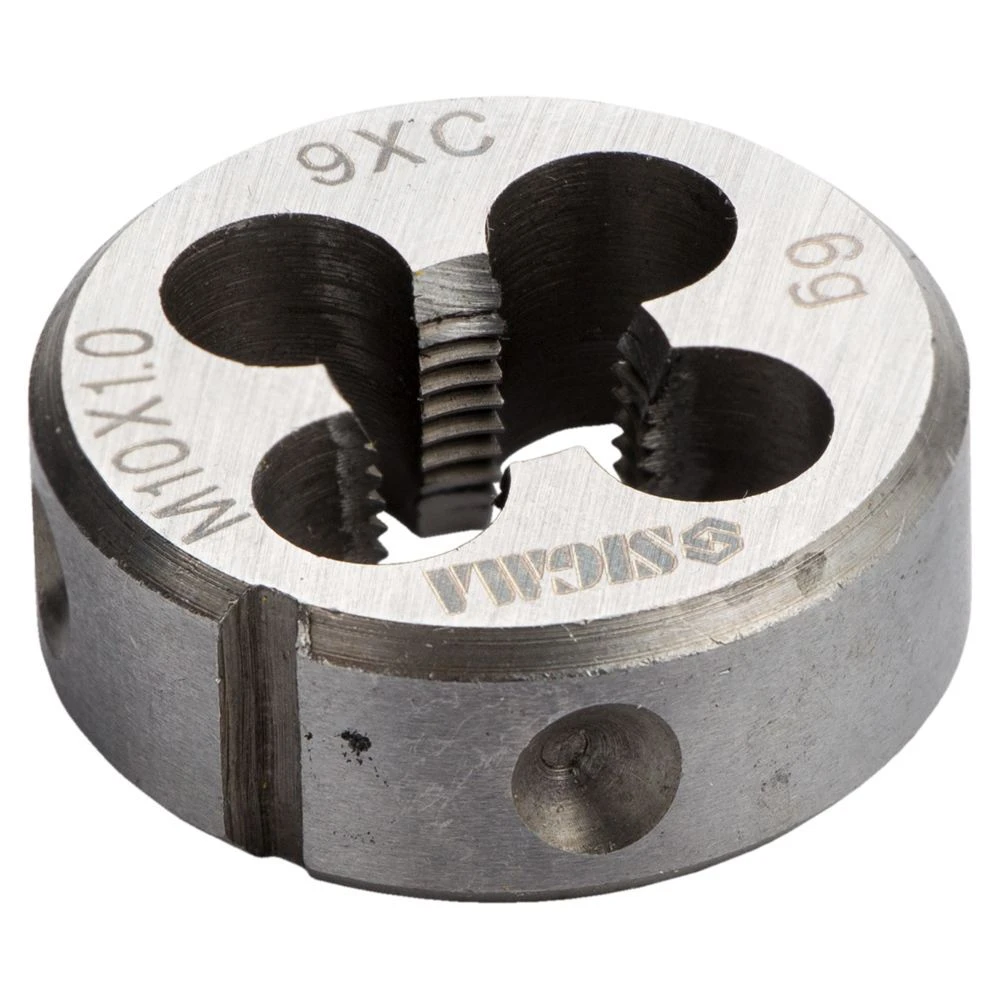 Плашка М10×1.0мм SIGMA (1604261) призначена для нарізування або калібрування зовнішніх різьб. Для роботи закріплюються в тримачах для плашок зі стопорними гвинтами. Для фіксації на зовнішньому циліндрі плашки існують конічні поглиблення і кутовий паз. При нарізанні, різьблення, попередньо, змащують консистентним мастилом.