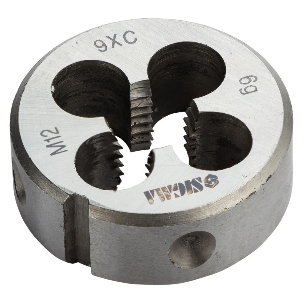 Плашка М12×1.75мм SIGMA (1604351) призначена для нарізування або калібрування зовнішніх різьб. Для роботи закріплюються в тримачах для плашок зі стопорними гвинтами. Для фіксації на зовнішньому циліндрі плашки існують конічні поглиблення і кутовий паз. При нарізанні, різьблення, попередньо, змащують консистентним мастилом.