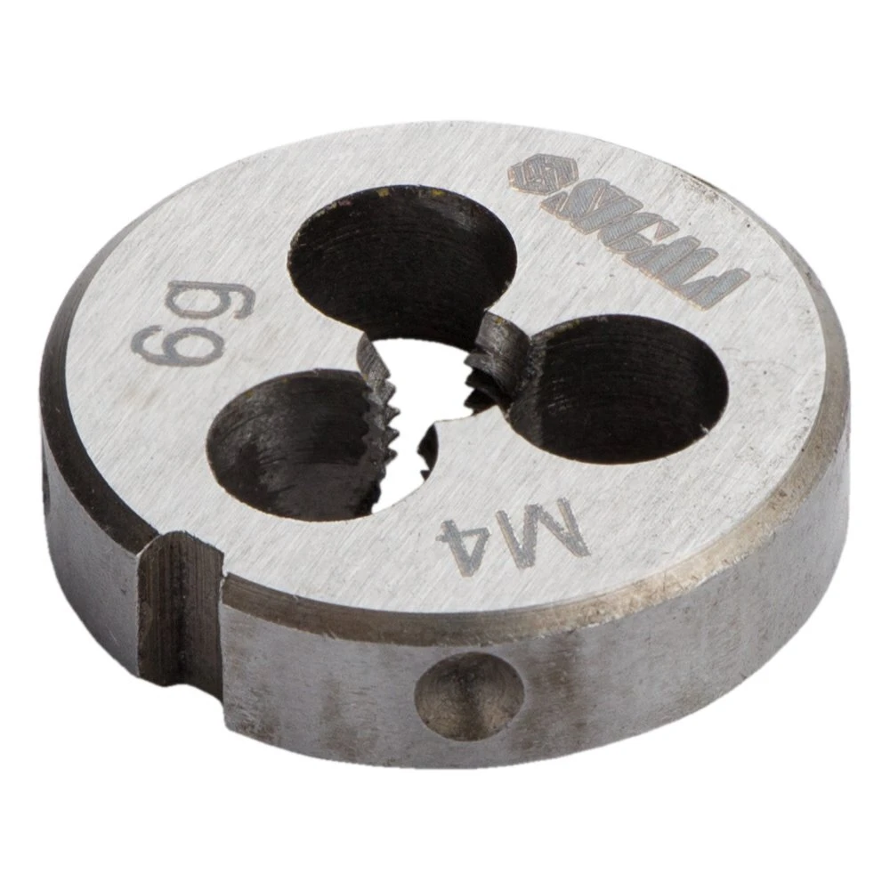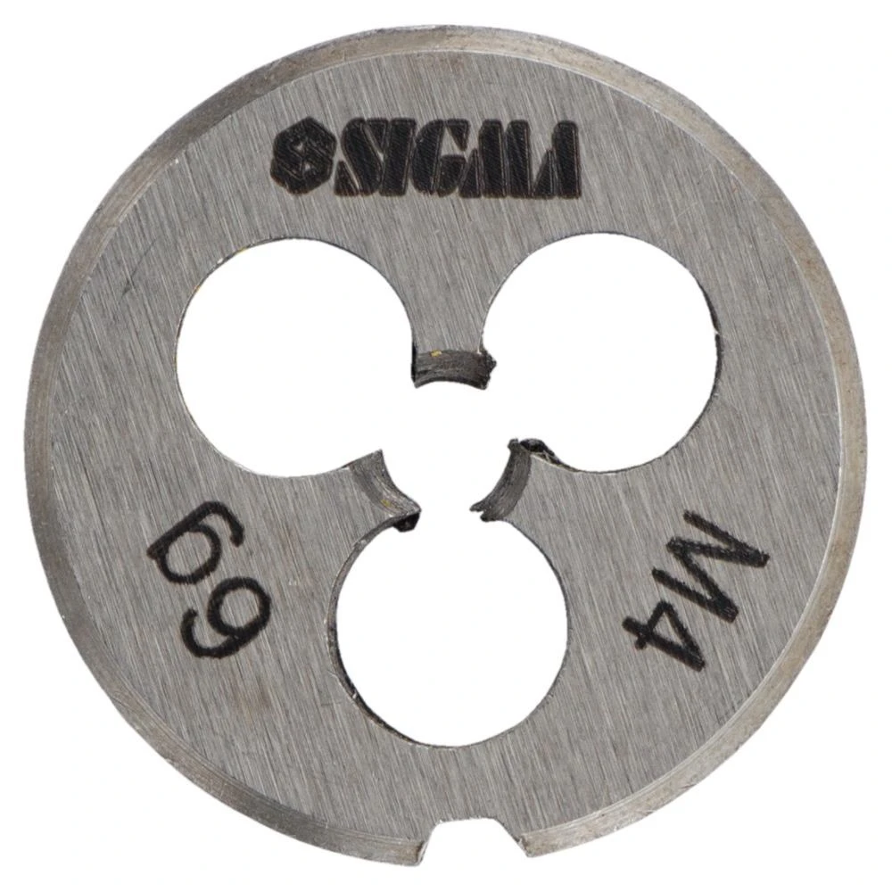 Плашка М4×0.7мм SIGMA (1604121) призначена для нарізування або калібрування зовнішніх різьб. Для роботи закріплюються в тримачах для плашок зі стопорними гвинтами. Для фіксації на зовнішньому циліндрі плашки існують конічні поглиблення і кутовий паз. При нарізанні, різьблення, попередньо, змащують консистентним мастилом.