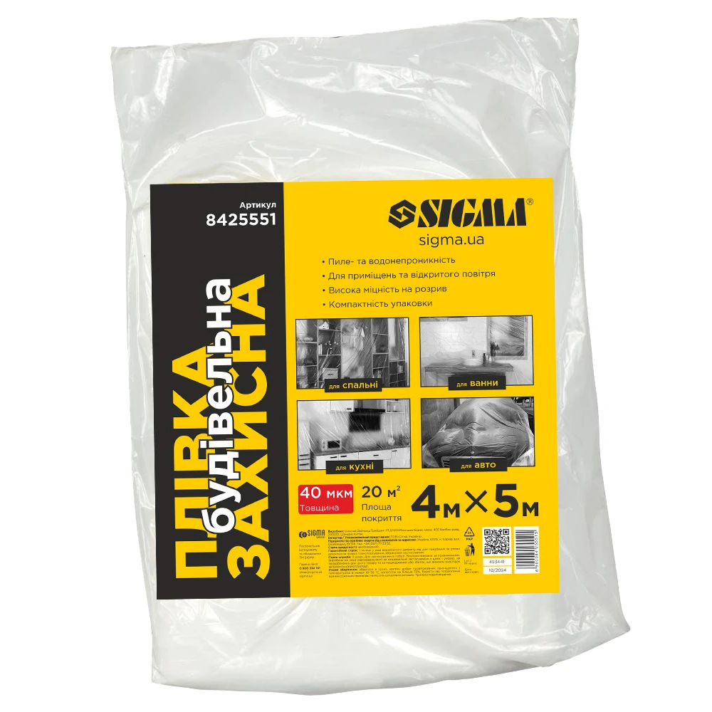 Плівка захисна будівельна 4×5м 40мкм SIGMA (8425551) застосовується для захисту різного виду поверхонь від зовнішніх забруднень при ремонтних та інших видах робіт.