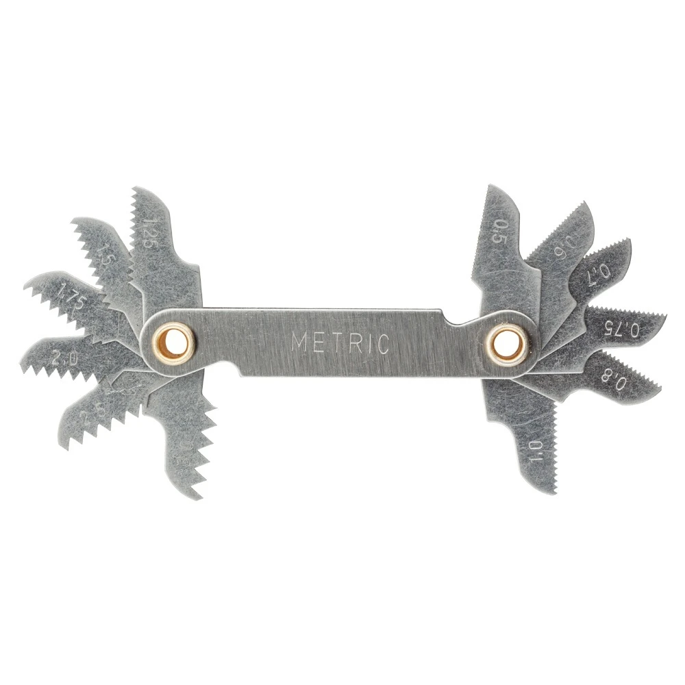 Різьбомір метричний 12 кроків SIGMA (1634121) призначений для визначення номінального розміру кроку зовнішньої і внутрішньої різьби. Для цього в резьбомери є марковані зубчасті пластини, що відкриваються за принципом розкладного ножа. Прикладаючи пластини по черзі до досліджуваної деталі до повного збігу ліній, визначають розмірність різьблення.