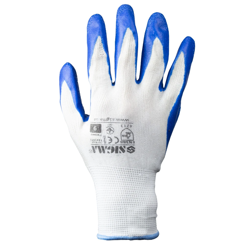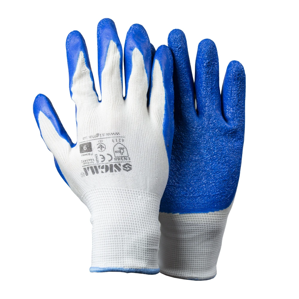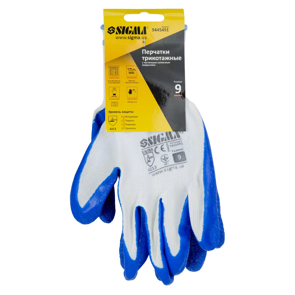 Рукавички трикотажні з частковим латексним покриттям крінкл р9 (сині, манжет) SIGMA (9445491) призначені для захисту від механічних впливів, від порізів і мають хороше зчеплення як з сухими так і з вологими поверхнями.