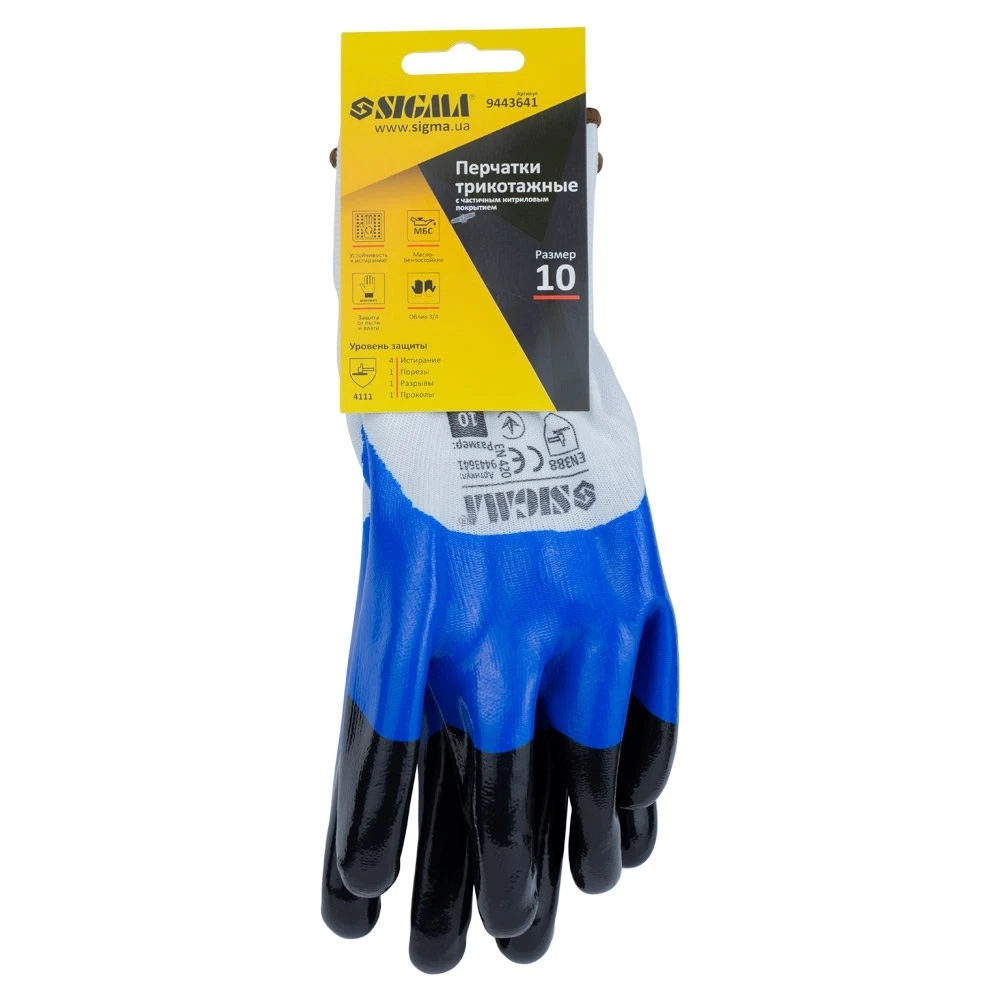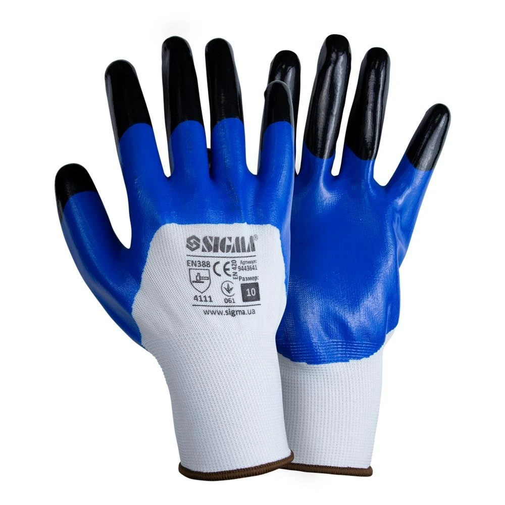 Рукавички трикотажні з частковим нітриловим покриттям посилені пальці р10 (синьо-чорні манжет) SIGMA (9443641) призначені для захисту від механічних впливів, жиру і масла. Застосовується для складських, сільськогосподарських, складальних робіт, в автосервісі, механічних, будівельних роботах.