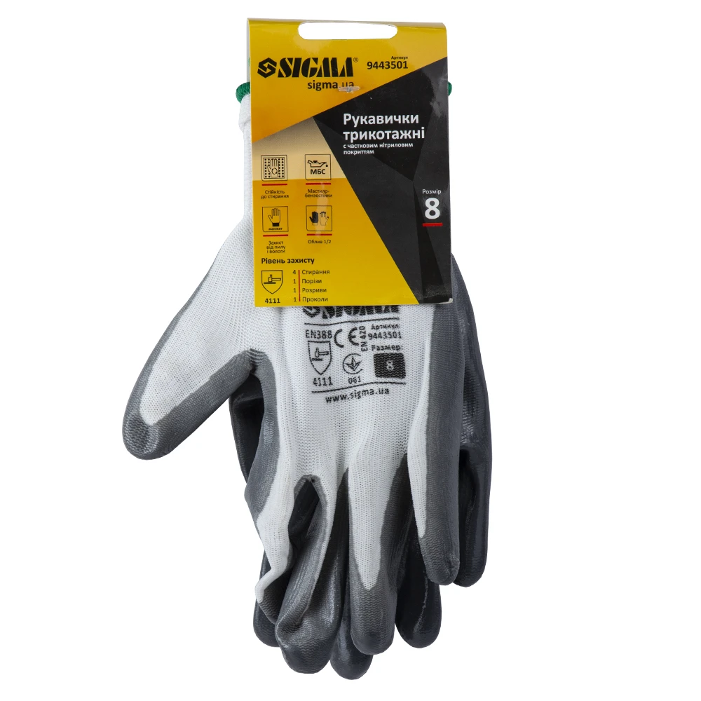 Рукавички трикотажні з частковим нітриловим покриттям р8 (сірі манжет) SIGMA (9443501) для захисту від механічних впливів, а так само є прекрасною перешкодою для жиру і масла.