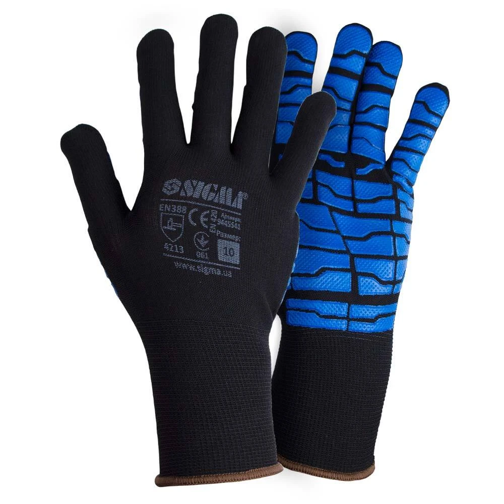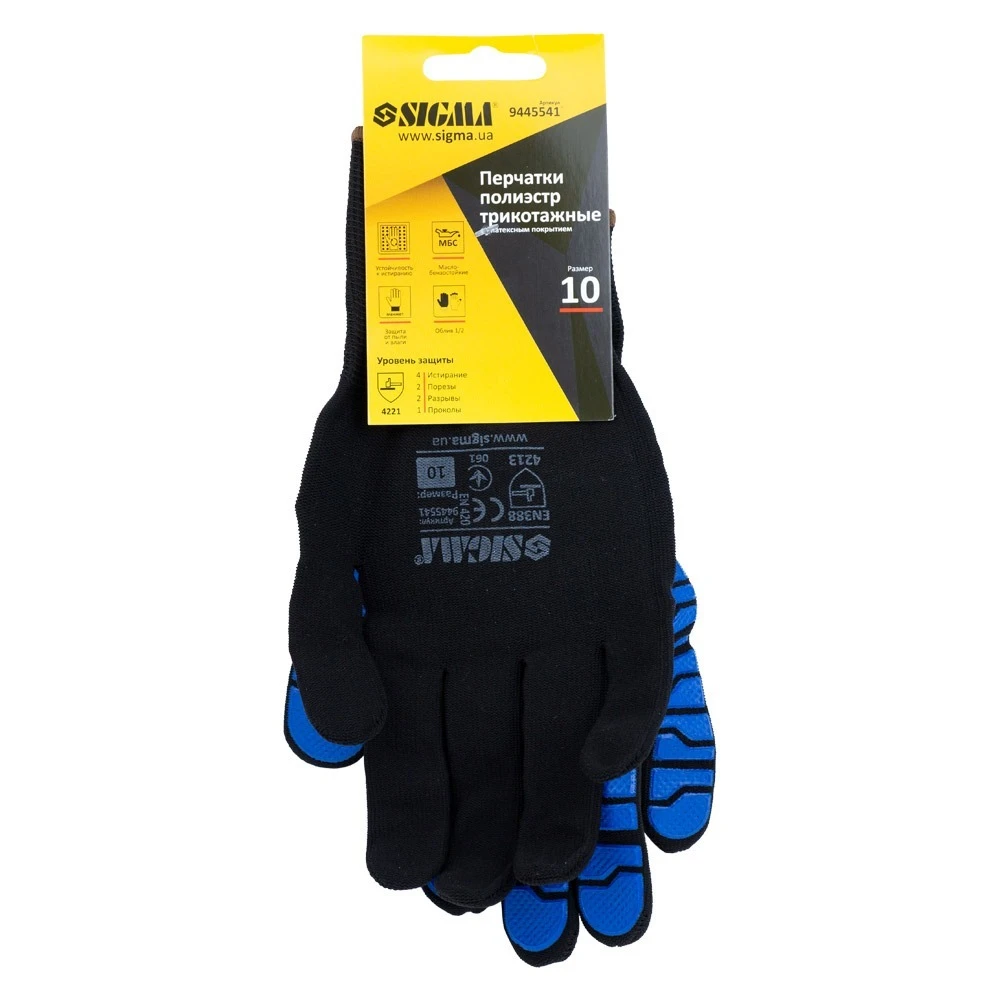 Рукавички трикотажні з латексним покриттям (павутина на долоні) р10 (сині манжет) Sigma (9445541) призначені для захисту від механічних впливів, жиру і масла. Застосовується для складських, сільськогосподарських, складальних робіт, в автосервісі, механічних, будівельних роботах.