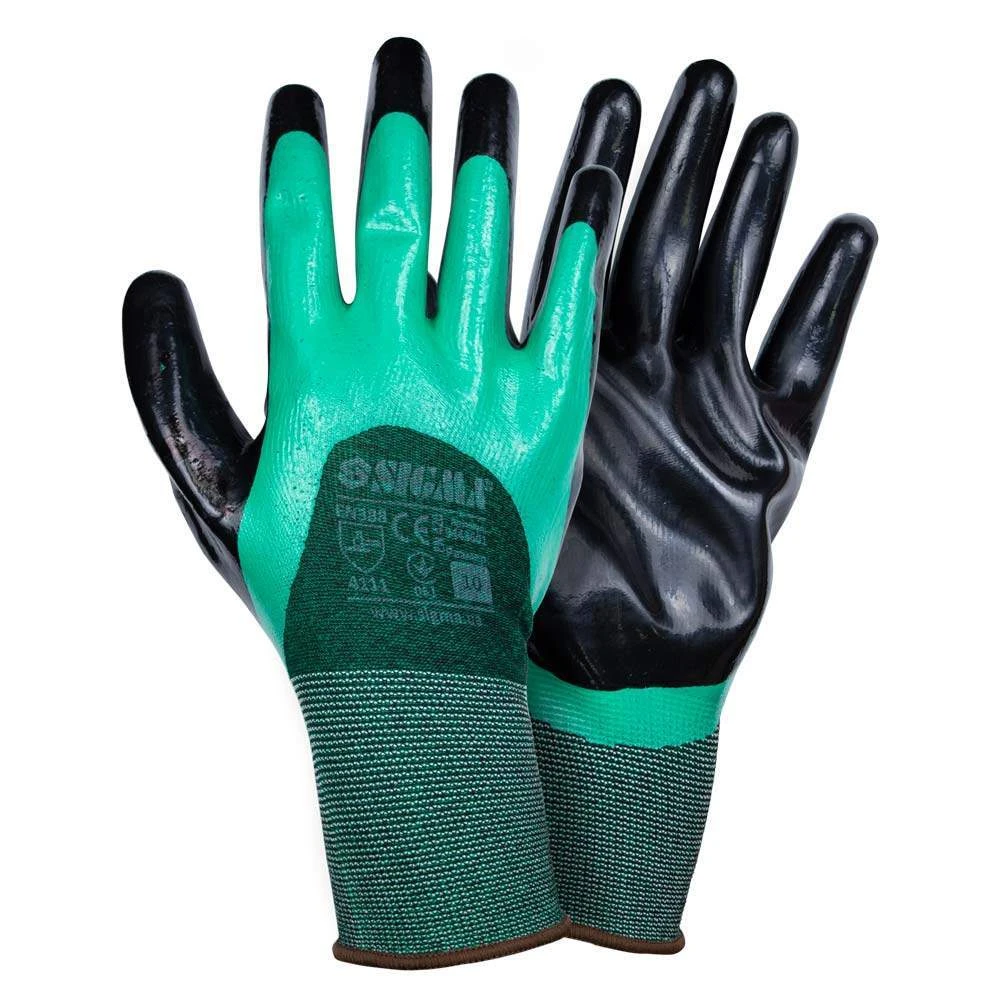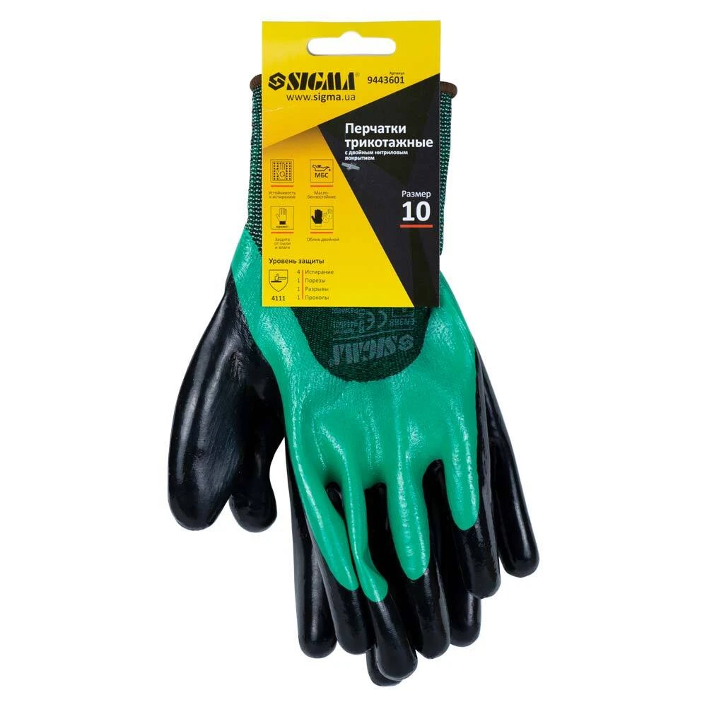 Рукавички трикотажні з подвійним нітриловим покриттям р10 (зелено-чорні манжет) SIGMA (9443601) призначені для захисту від механічних впливів, жиру і масла. Оптимально підходять для робіт, де необхідна висока точність. Завдяки довговічності нітрилового покриття особливої популярності рукавички придбали на СТО, шиномонтажних майстерень.