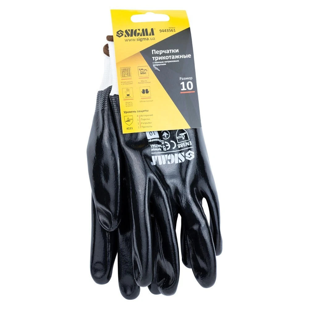 Рукавички трикотажні з повним нітриловим покриттям р10 (чорні манжет) SIGMA (9443561) призначені для захисту від механічних впливів, жиру і масла. Оптимально підходять для робіт, де необхідна висока точність. Завдяки довговічності нітрилового покриття особливої популярності рукавички придбали на СТО, шиномонтажних майстерень.