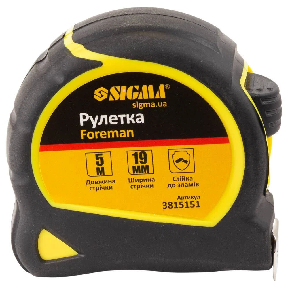 Рулетка Foreman 5м×19мм без ремінця SIGMA (3815151) виготовлена з високоміцного пластика. Обрезинені вставки забезпечують зручність в роботі, перешкоджаючи вислизанню інструменту з рук і захищають корпус від механічних пошкоджень.