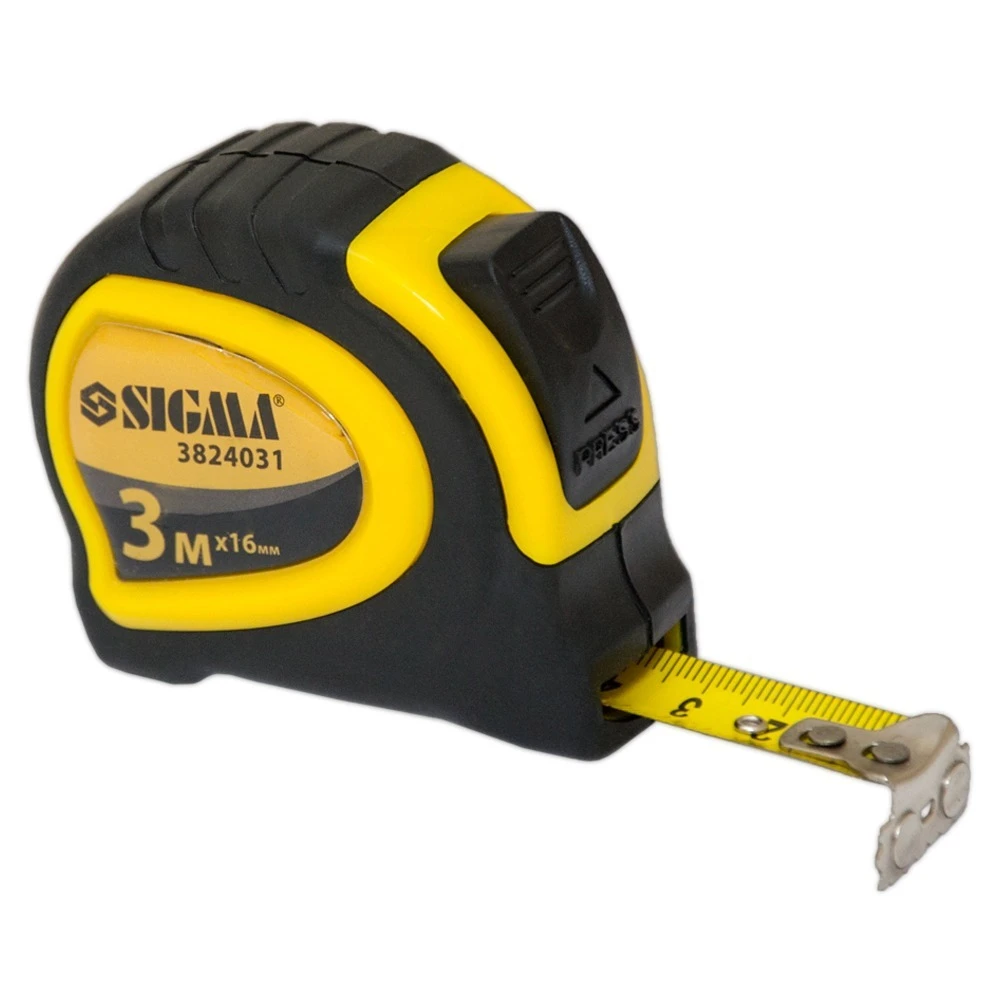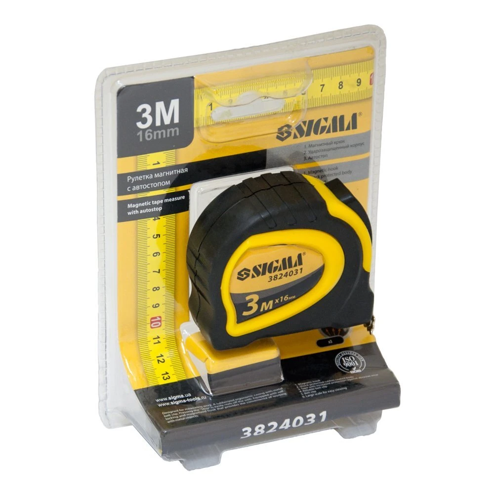 Рулетка магнітна обгумована з автостопом 3м×16мм SIGMA (3824031) призначена для вимірювальних робіт. Прогумований корпус ергономічної форми з металевим поясним затиском. Кнопка "стоп" при натисканні забезпечує вільне змотування полотна. Оснащена автостопом і намагніченим гаком, який забезпечує зручність роботи з металевими предметами.
