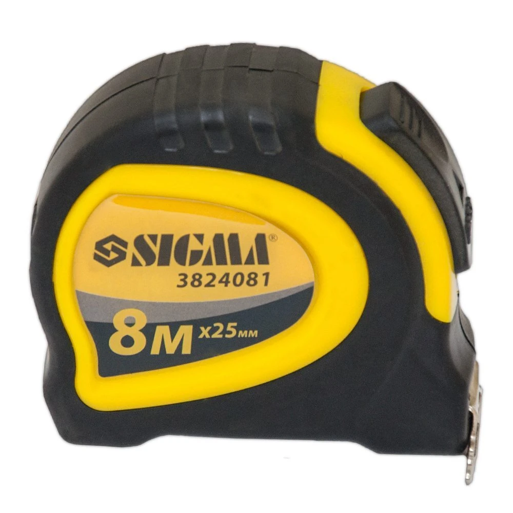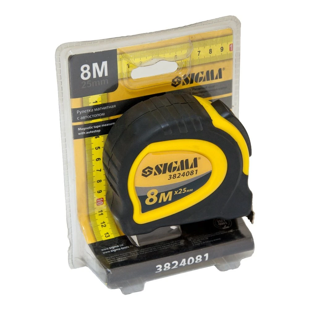 Рулетка магнітна обгумована з автостопом 8м×25мм SIGMA (3824081) призначена для вимірювальних робіт. Прогумований корпус ергономічної форми з металевим поясним затиском. Кнопка "стоп" при натисканні забезпечує вільне змотування полотна. Оснащена автостопом і намагніченим гаком, який забезпечує зручність роботи з металевими предметами.
