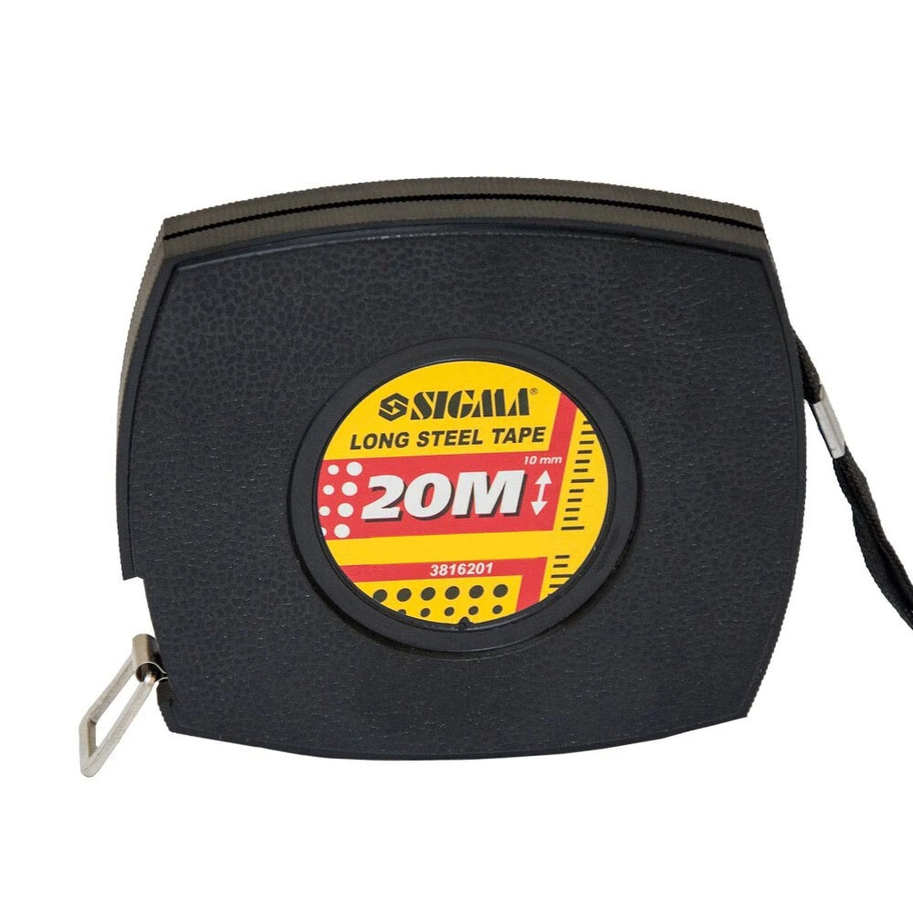 Рулетка сталева стрічка 20м×10мм (чорна) SIGMA (3816201) має корпус закритого типу виготовлений з полікарбонату з ремінцем для носіння на руці.