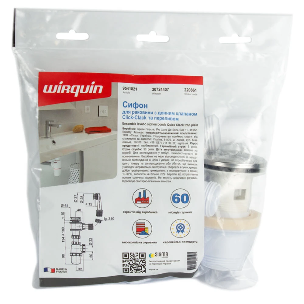 Сифон для раковини з донним клапаном Click-Clack та переливом 1¼"ר32мм WIRQUIN (9541821)