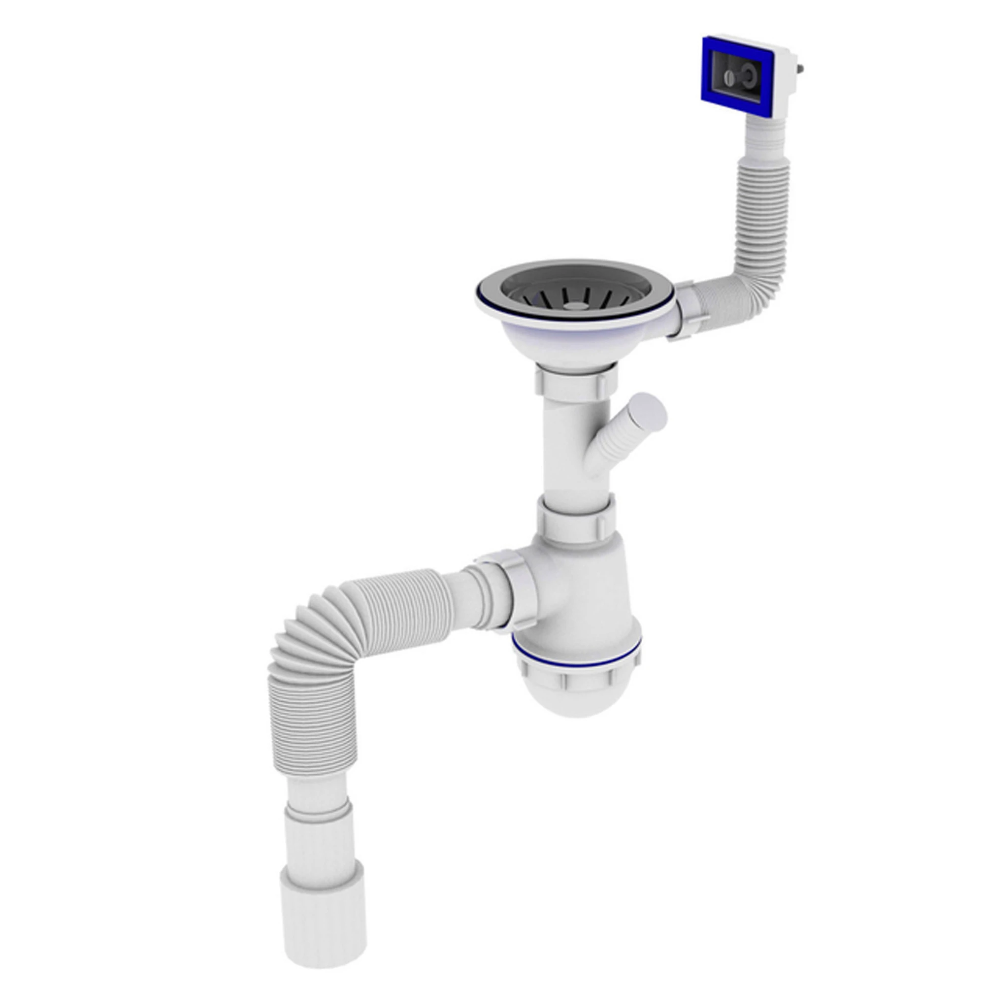Сифон OPTIMUM для кухонної мийки пляшкового типу 1 1/2″*40 з різьбовим випуском 3 1/2″ і нержавіючою сіткою діаметром 113 мм, з відведенням для підключення пральної машини, з гнучким прямокутним переливом. Для підключення до каналізації комплектується з гнучкою трубою 40*40/50.