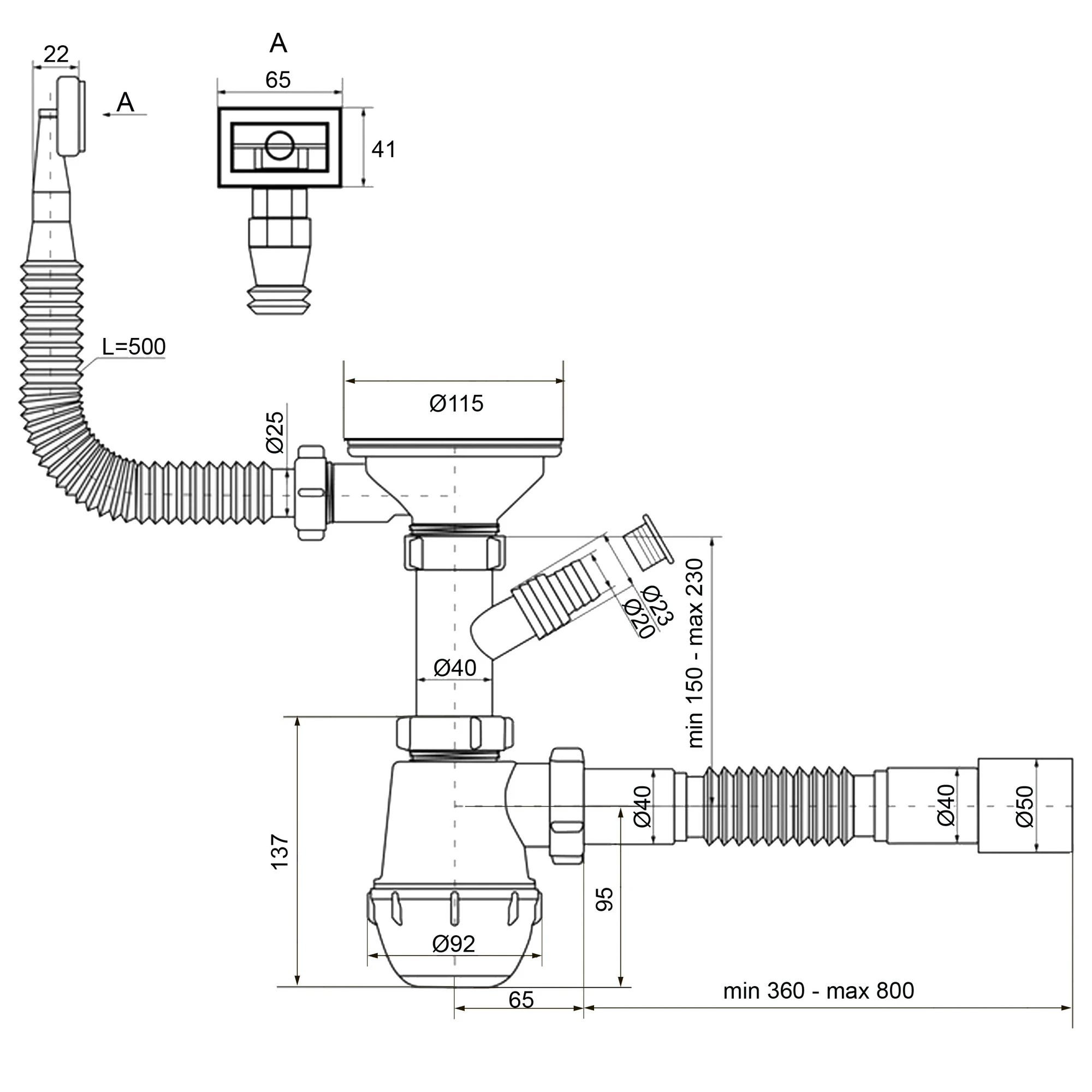 - відвідна гнучка трубка до каналізації довжиною 360-800 мм;