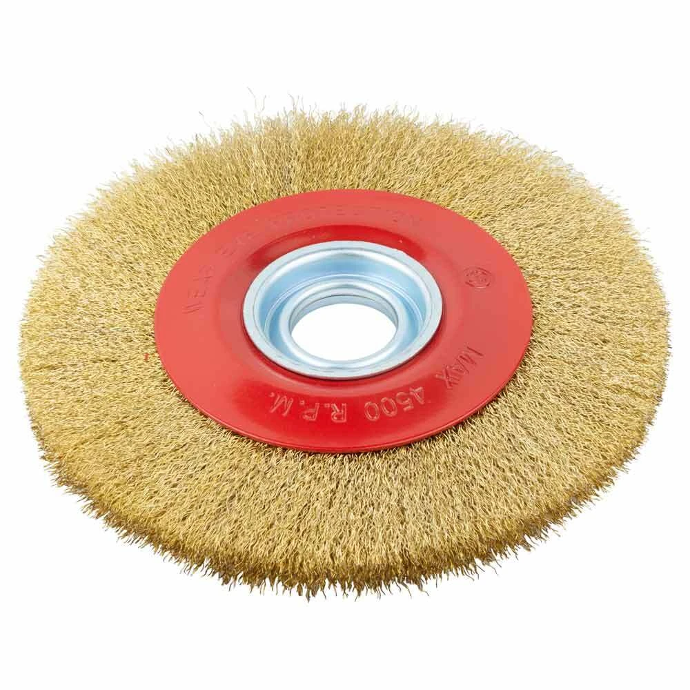 Щітка дротяна дископодібна Ø200мм Ø32мм (латуньована) SIGMA (9012371) застосовується для механічного очищення поверхні виробів від природних або штучних нашарувань - застарілих лакофарбових покриттів, бруду, іржі, окалини, шлаку і бризок.
