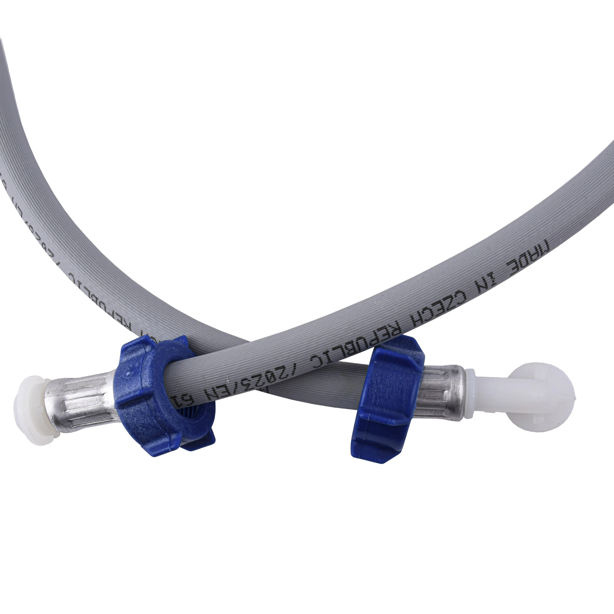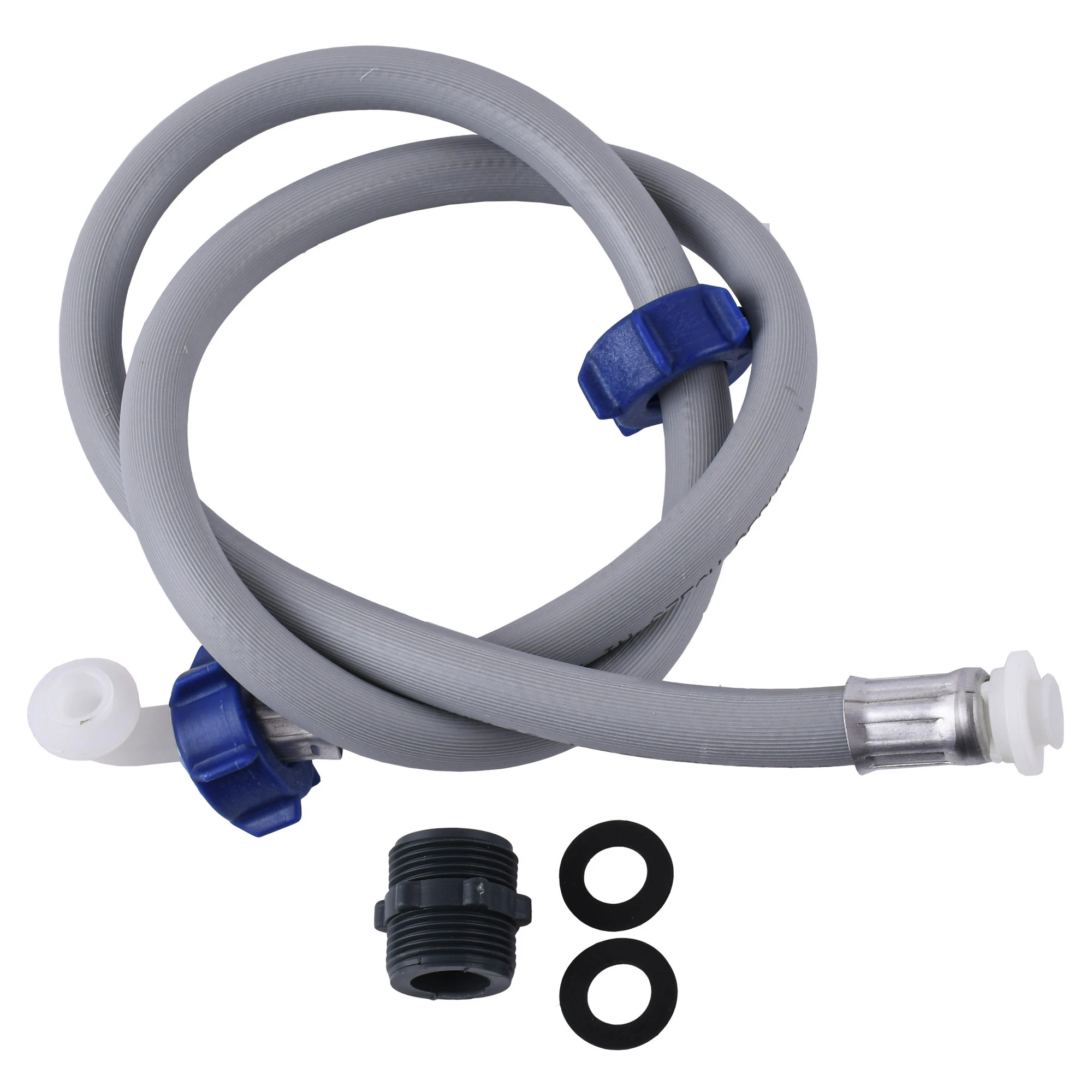 При виробництві заливних шлангів використовується нетоксичний каучук EPDM, який служить внутрішнім шаром і армується 28 поліефірними нитками, укладеними по спіралі. Зовнішнім шаром є сірий рифлений полівінілхлорид. Кінцеві деталі, в даному випадку гайки, виготовлені з високоміцного поліамідного з'єднання. Обтискові гільзи - з алюмінію. Кожен заливний шланг для пральної машини укомплектований фільтрами грубого очищення у вигляді поліпропіленової сіточки.