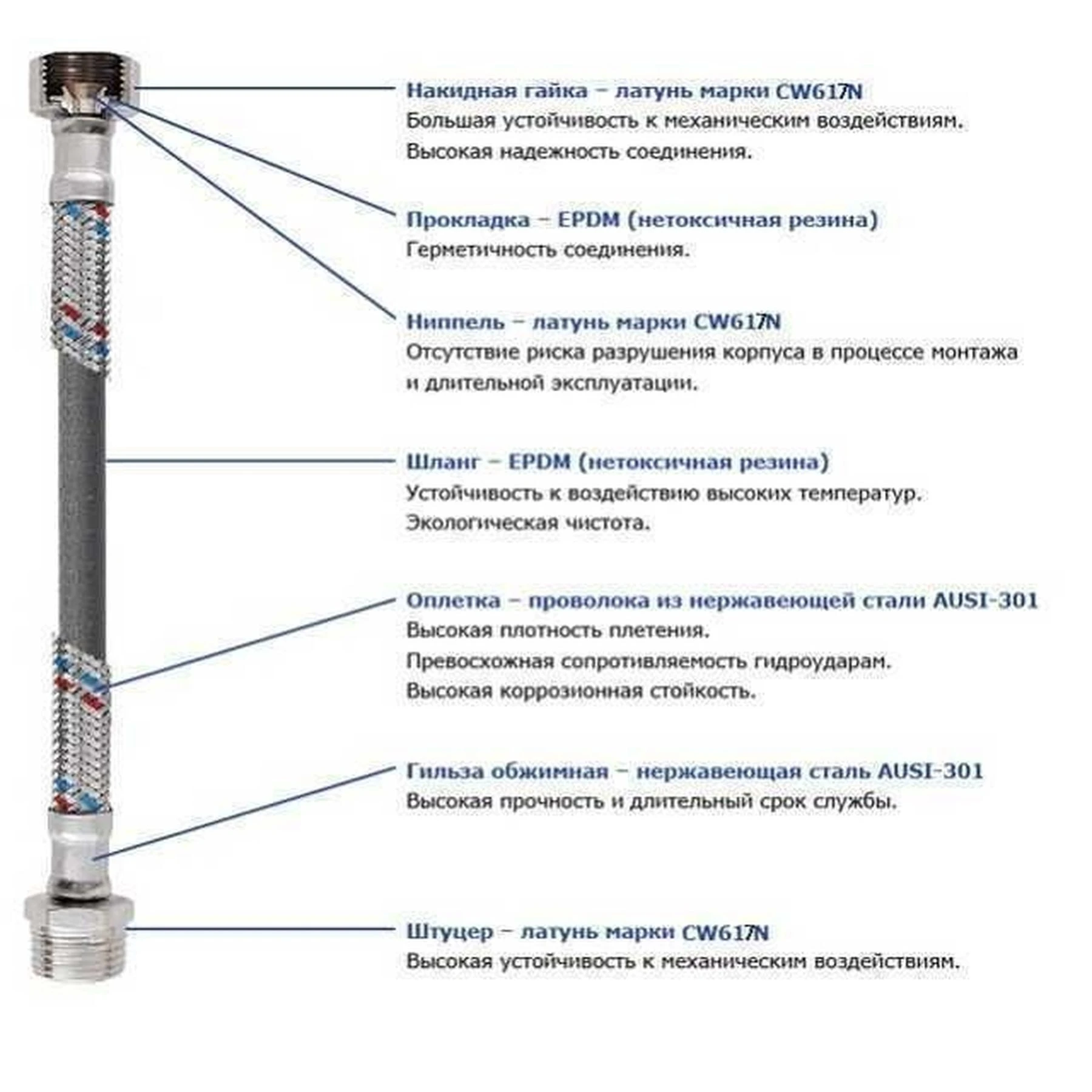 1. Гумовий шланг EPDM - зроблений з нетоксичної гуми, відрізняється надійністю і широким діапазоном допустимих температур. Червоні і сині нитки, вплетені в оплетку, свідчать про можливість використання гнучкого шланга для гарячої та холодної води.