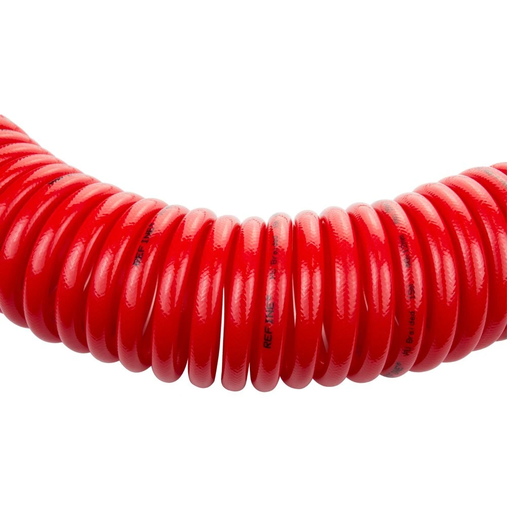 Шланг спіральний поліуретановий (PU) армований 15м 8×12мм REFINE (7013531) використовується для передачі повітря в пневматичних системах стандартного тиску. Має хорошу стійкість до механічних впливів (перегини, здавлювання, скручування) і швидко відновлює свою первинну форму після зняття механічного впливу. Шланг не схильний до гідролізу і має хорошу стійкість до впливу озону і мікроорганізмів.