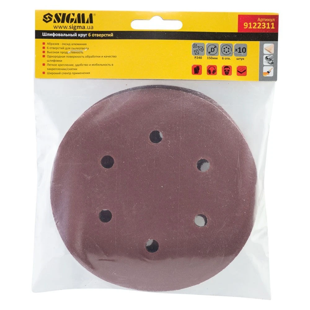 Шліфувальний круг 6 отворів Ø150мм P240 (10шт) SIGMA (9122311) призначений для сухого високошвидкісного шліфування. За властивостями є багатофункціональним абразивом. В основному застосовується в автомобільній промисловості, деревообробці і металообробці.