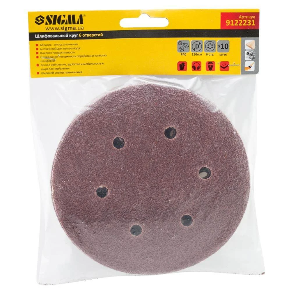 Шліфувальний круг 6 отворів Ø150мм P40 (10шт) SIGMA (9122231) призначений для сухого високошвидкісного шліфування. За властивостями є багатофункціональним абразивом. В основному застосовується в автомобільній промисловості, деревообробці і металообробці.
