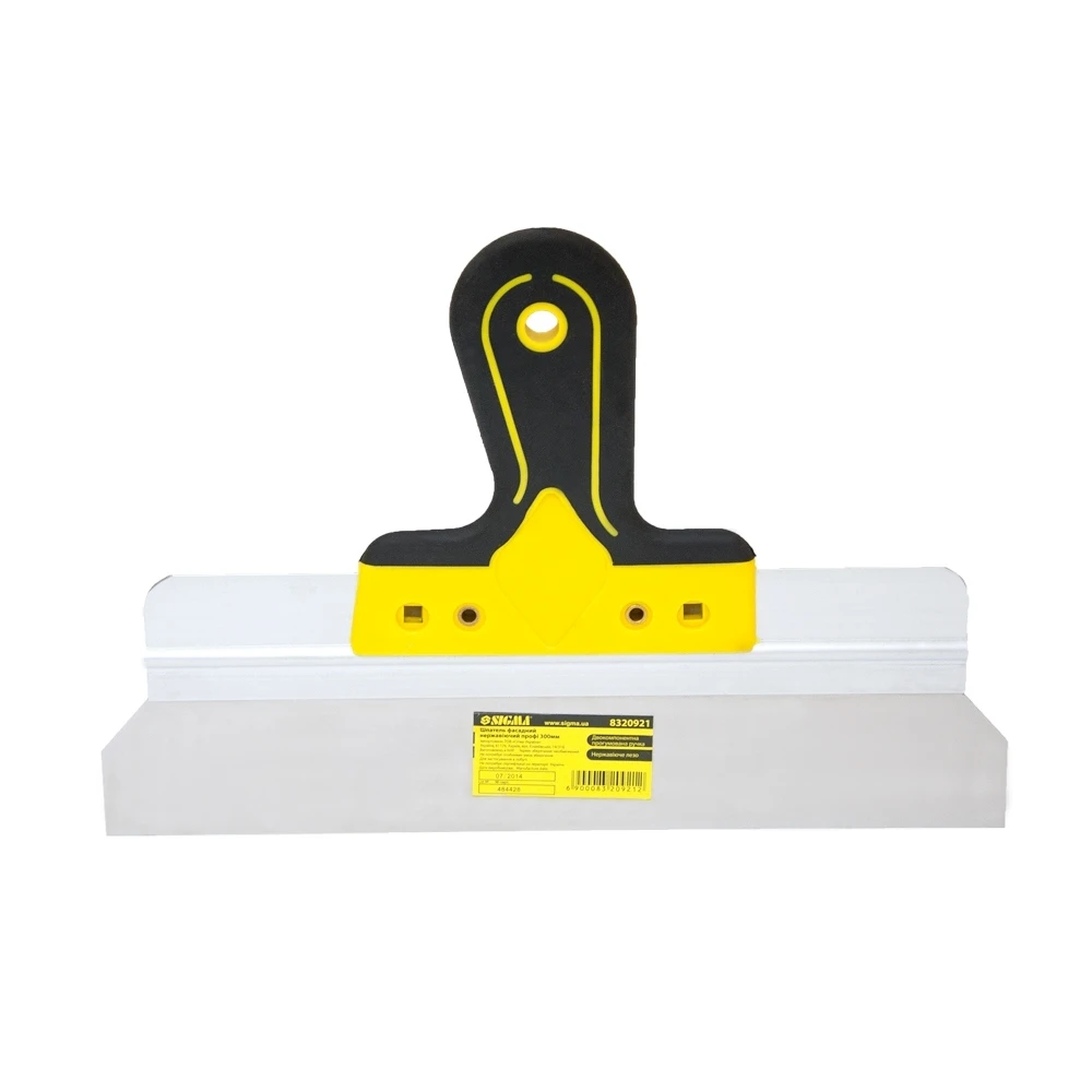 Шпатель фасадний (нержавіючий) профі 300мм SIGMA (8320921) - застосовується для штукатурення зовнішніх і внутрішніх стін, стель, а також для нанесення шпаклівок, мастик і густих клейових сумішей. Робоче полотно виготовлено з високоміцної високолегованої нержавіючої сталі. Завдяки цьому лезо легко повертається у вихідну форму навіть після значних деформуючих навантажень і відрізняється високою зносостійкістю. Завдяки ергономічній формі двокомпонентна прогумована ручка запобігає появі передчасної втоми при виконанні великого об'єму робіт.