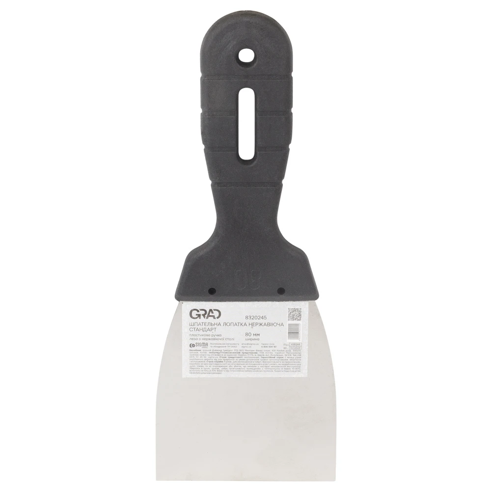 Шпательна лопатка стандарт (нержавіюча) 80мм GRAD (8320245) з нержавіючим лезом, яке має змінну товщину для додаткової гнучкості і пружності. Інструмент наділений пластиковою ручкою. Шпатель застосовується для штукатуріванія зовнішніх і внутрішніх стін, стель - для нанесення шпаклівок, мастик і густих клейових сумішей.
