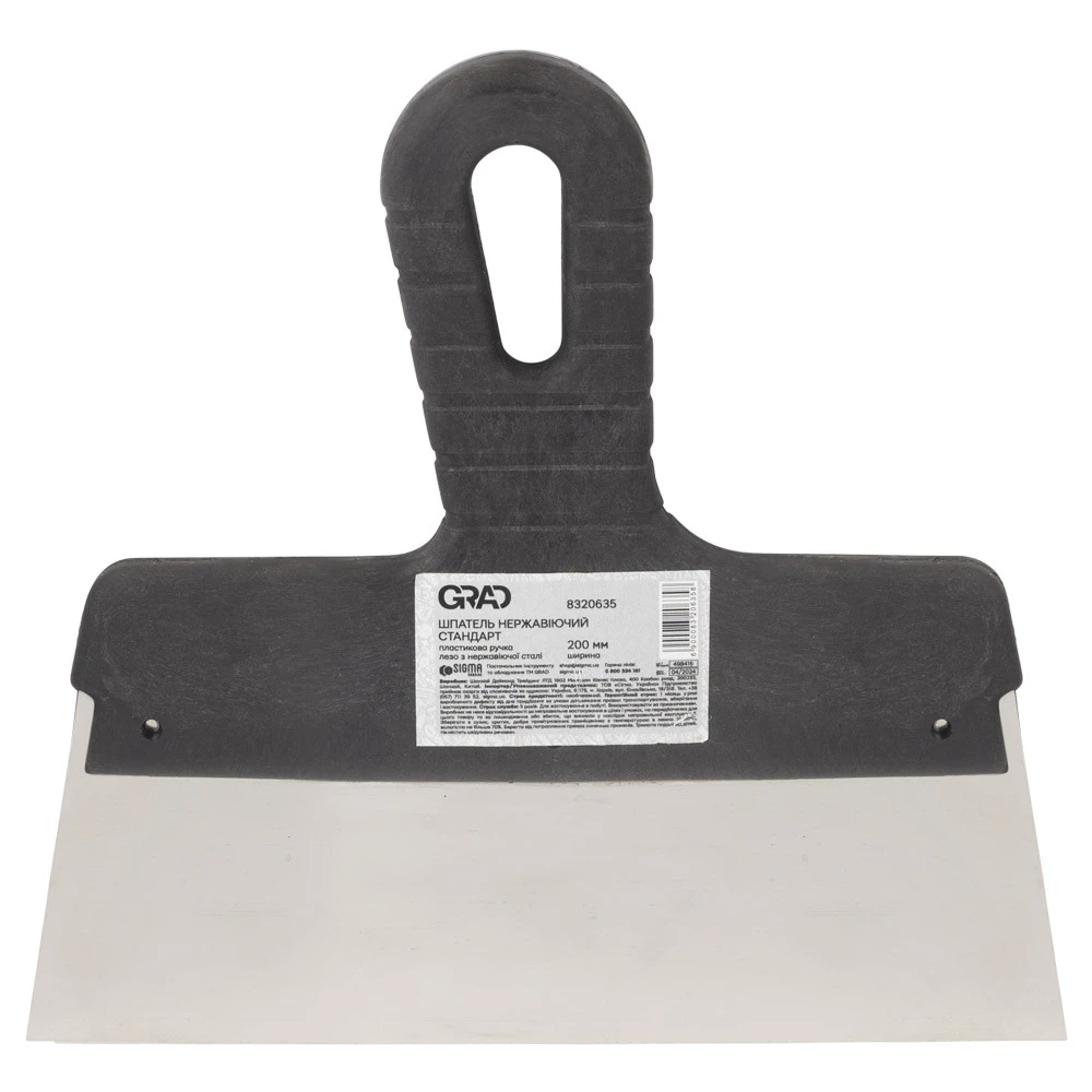 Шпатель стандарт (нержавіючий) 200мм GRAD (8320635) яке має змінну товщину для додаткової гнучкості та пружності. Інструмент оснащений пластиковою ручкою. Шпатель застосовується для оштукатурювання зовнішніх та внутрішніх стін, стель, для нанесення шпаклівок, мастик і густих клейових сумішей.