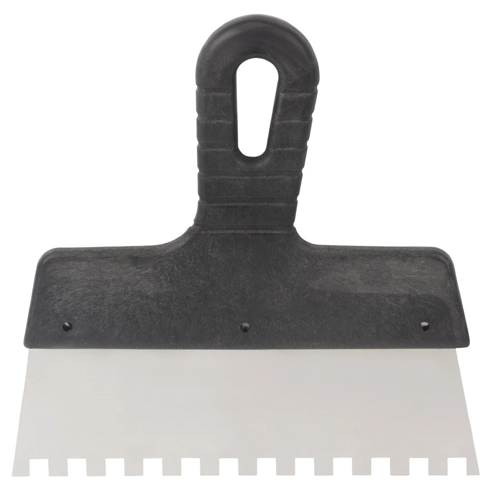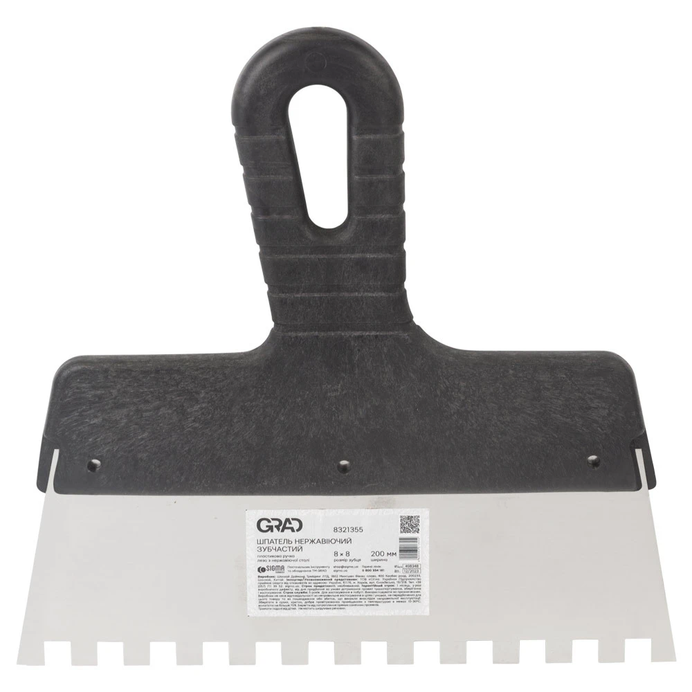 Шпатель зубчастий (нержавіючий) 200мм 8×8мм GRAD (8321355) яке має змінну товщину для додаткової гнучкості та пружності. Інструмент оснащений пластиковою ручкою. Шпатель застосовується для оштукатурювання зовнішніх та внутрішніх стін, стель, для нанесення шпаклівок, мастик і густих клейових сумішей.