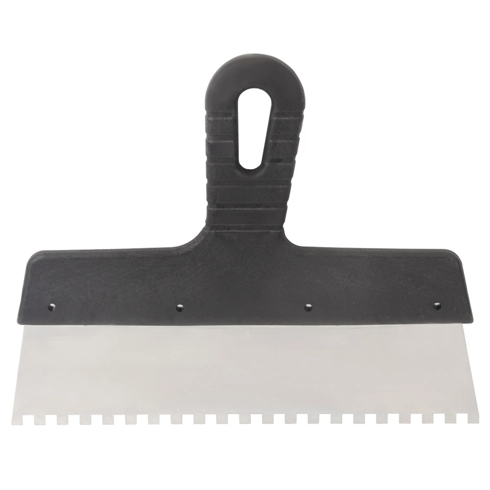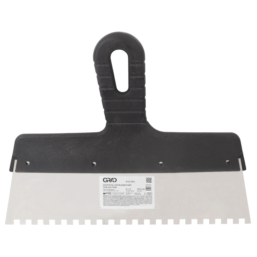 Шпатель зубчастий (нержавіючий) 250мм 6×6мм GRAD (8321365) яке має змінну товщину для додаткової гнучкості та пружності. Інструмент оснащений пластиковою ручкою. Шпатель застосовується для оштукатурювання зовнішніх та внутрішніх стін, стель, для нанесення шпаклівок, мастик і густих клейових сумішей.