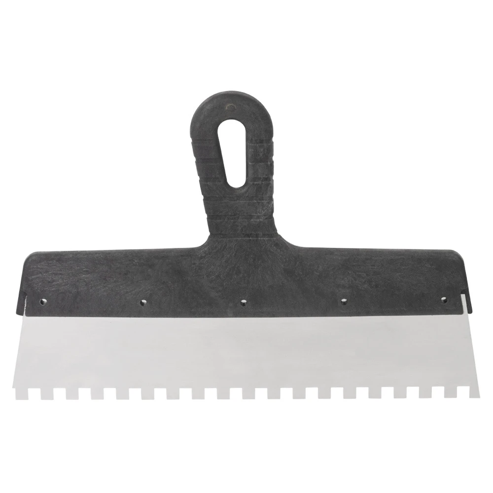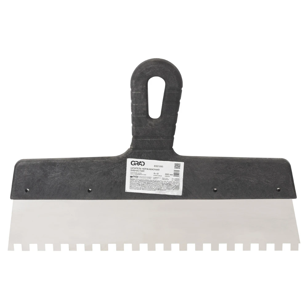 Шпатель зубчастий (нержавіючий) 300мм 8×8мм GRAD (8321395) яке має змінну товщину для додаткової гнучкості та пружності. Інструмент оснащений пластиковою ручкою. Шпатель застосовується для оштукатурювання зовнішніх та внутрішніх стін, стель, для нанесення шпаклівок, мастик і густих клейових сумішей.