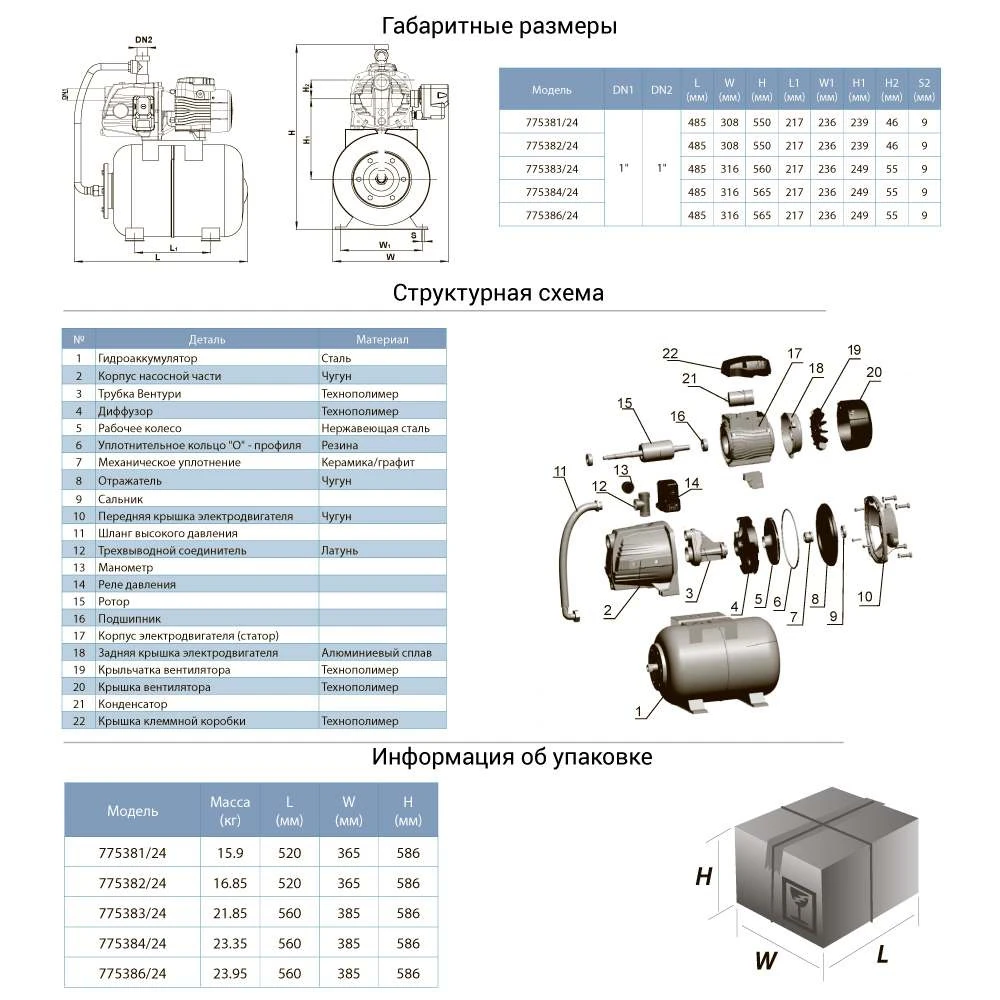 Станції водопостачання обладнані гідроакумулятором об'ємом 24 літра. Реле тиску управляє роботою електронасоса - настройка реле тиску Р (вкл) 1.4 бар/Р (викл) 2.8 бар. Станції призначені для перекачування чистої води і можуть застосовуватися: для побутового водопостачання, допоміжного обладнання, підйому води в трубопроводах високого і низького тиску, для зрошувальних систем садів і городів, теплиць і парників.