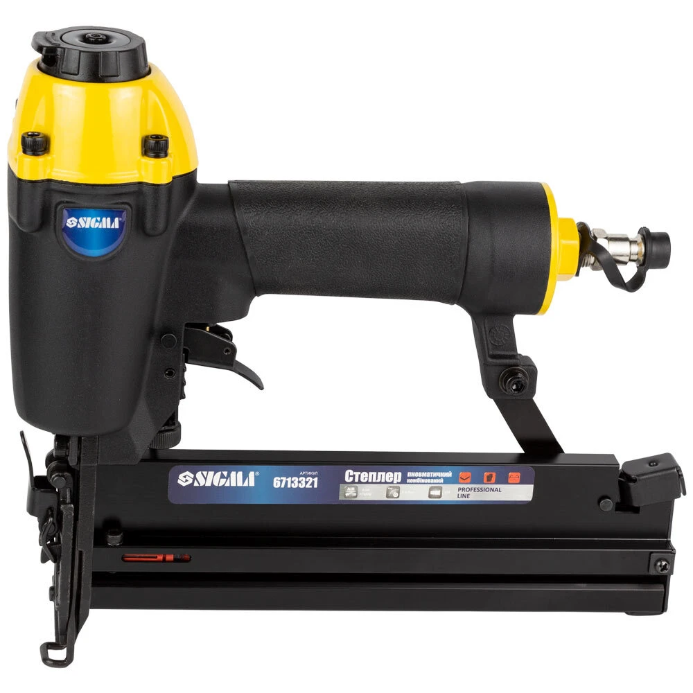 Степлер пневматичний комбінований "Plus" 0.04л/удар 5-7бар скоба 5.8мм (16-40мм) 1.25×1мм цвях (10-50мм) 1.25×1мм SIGMA (6713321) призначений для швидкого скріплення матеріалів за допомогою цвяхів і скоб. Використовується при виконанні будівельних, монтажних, оббивних і столярних робіт для кріплення листових матеріалів до різних поверхонь (дерева, гіпсокартону, фанери, ДВП, шкіри, тканини і т.п.).