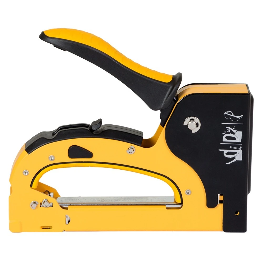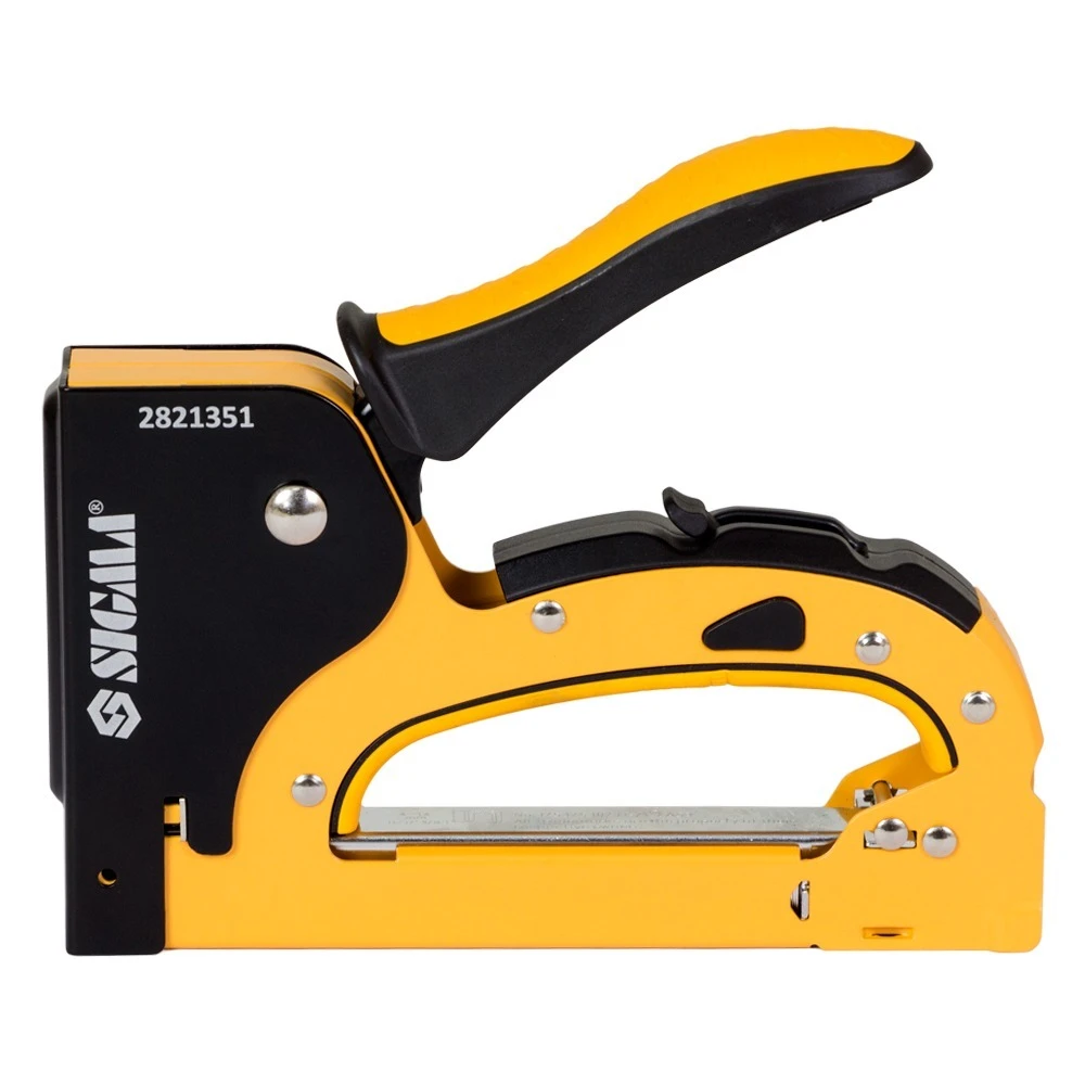 Степлер з регулятором ресорного типу 4-14мм SIGMA (2821351) призначений для швидкого кріплення листового матеріалу (оргаліту, фанери, ДСП, ДВП, плівки, утеплювача) до основи. Незамінний при складанні меблів, укладанні килимового покриття, а також при фіксації утеплювача, обшивці м'яких меблів, багетних роботах. Використовується з скобами 53 типу розміром 4-14 мм. Повністю металева конструкція степлера з регулятором сили удару і гумова накладка на ручці сприяє зручній роботі зі степлером і тривалого терміну служби (не менше 50 000 ударів). Степлер має функцію швидкого складання ручки без додаткового її натискання. Щоб скласти ручку, потрібно просто відтягнути її на себе до упору і опустити вниз.