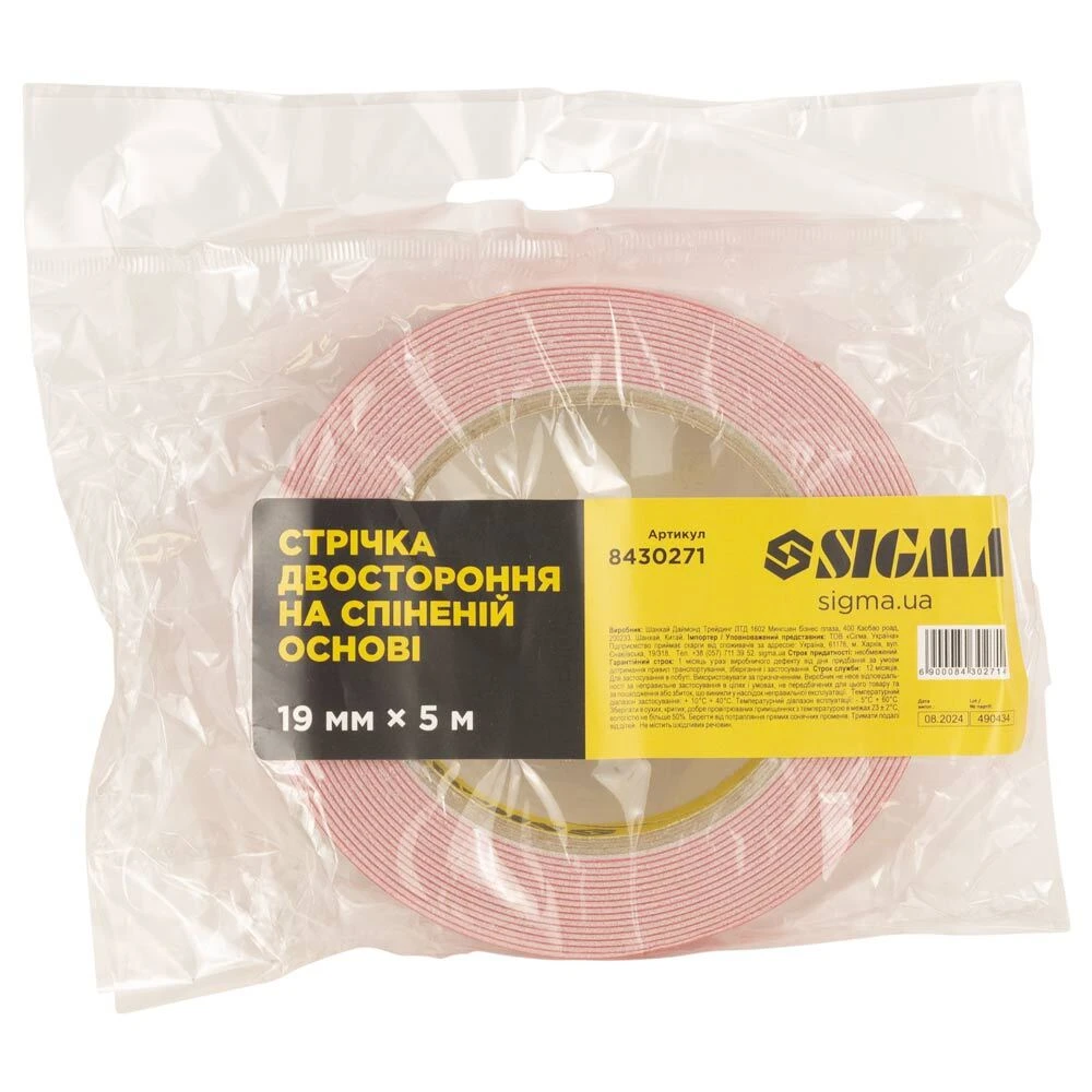 Стрічка двостороння на спіненій основі 19мм×5м SIGMA (8430271) - це пінополіетилен, який з обох сторін заламінований клейовим шаром. Він володіє помірною міцністю та підвищеною початковою липкістю.