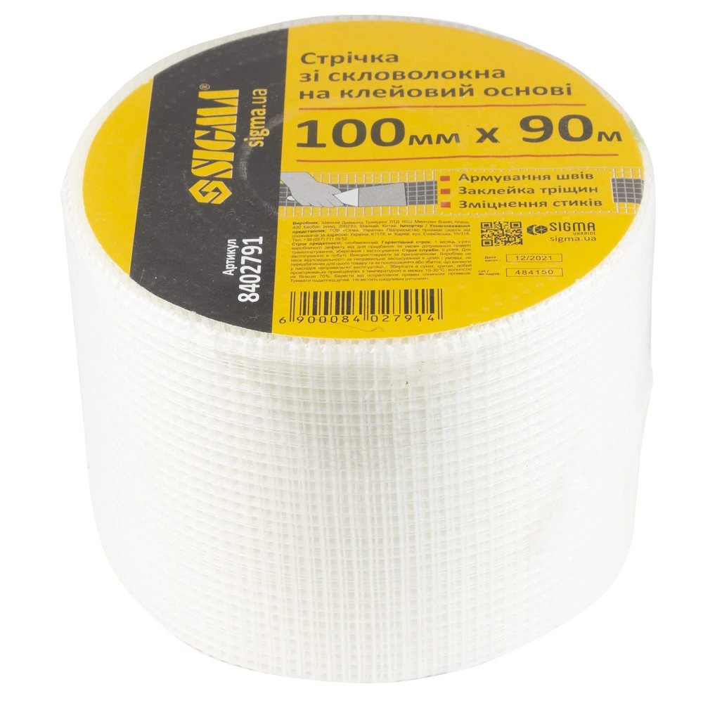 Спеціальна Стрічка склотканинна на клейовій основі 100мм×90м SIGMA (8402791) використовується для запобігання утворення тріщин і зміцнення поверхонь.