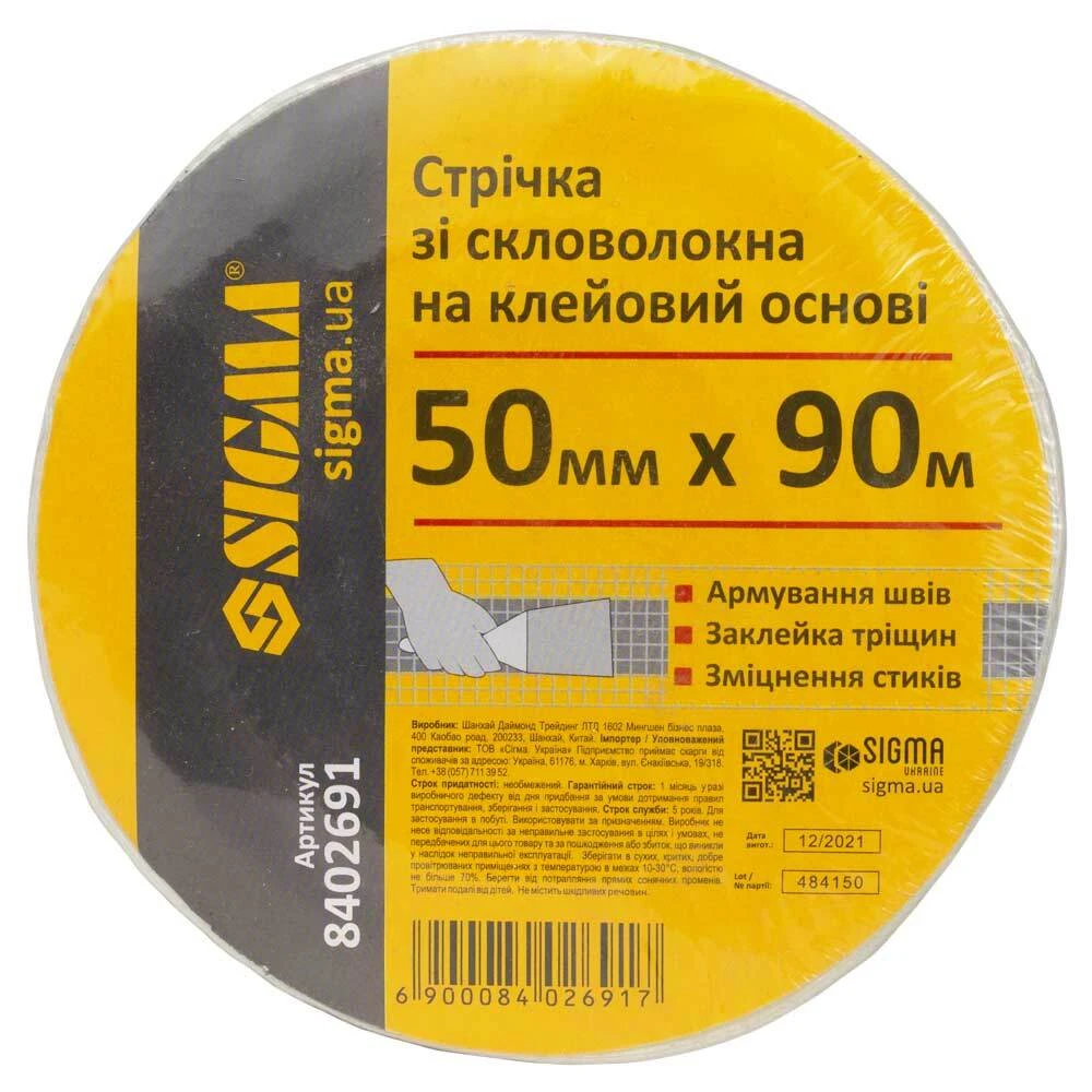 Стрічка склотканинна на клейовій основі 50мм×90м SIGMA (8402691) використовується для запобігання утворення тріщин і зміцнення поверхонь.