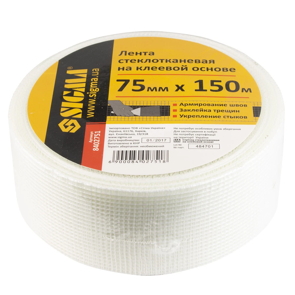 Спеціальна Стрічка склотканинна на клейовій основі 75мм×150м SIGMA (8402751) використовується для запобігання утворення тріщин і зміцнення поверхонь.