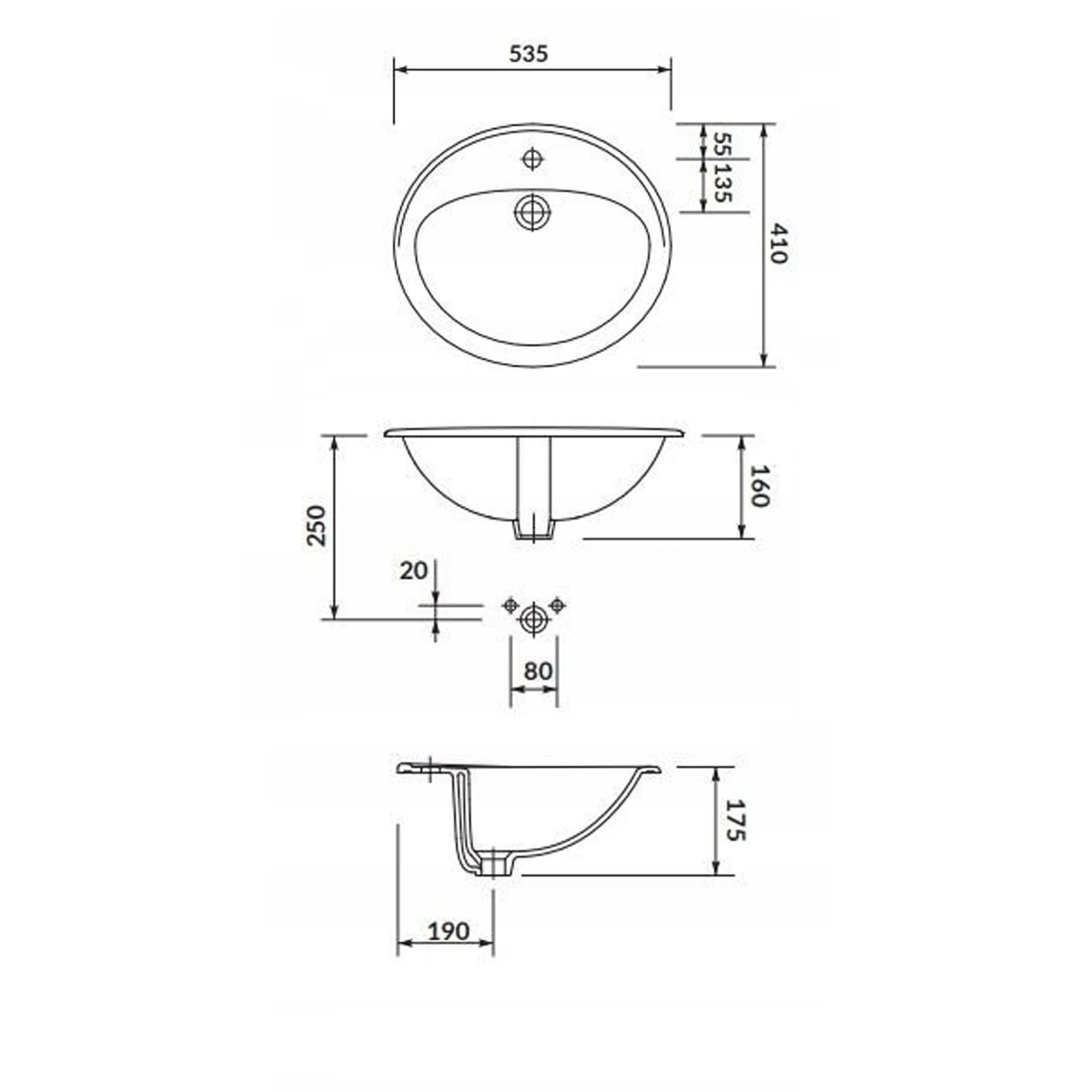 Умивальник CALLA 54 має отвір для змішувача і перелив. До раковини входить шаблон, який полегшує вирізання монтажних отворів.