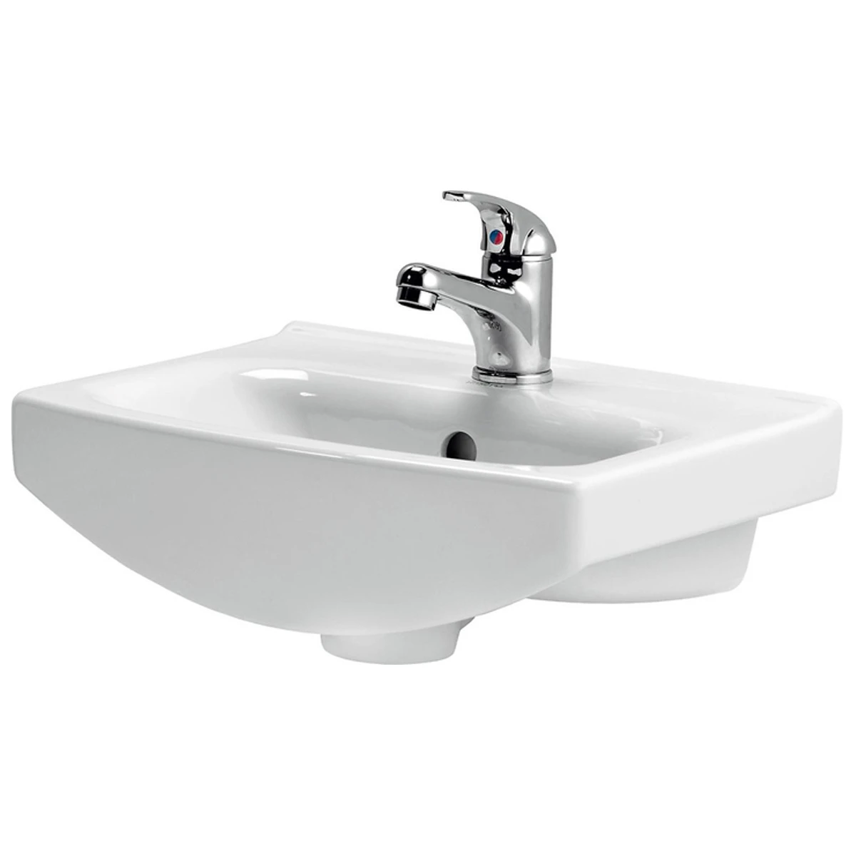 Керамічний умивальник CERSANIA NEW 40 з отвором для змішувача та переливом був пристосований для установки з меблями серії OLIVIA, BIANCO та MELAR або безпосередньо до стіни з декоративним сифоном.