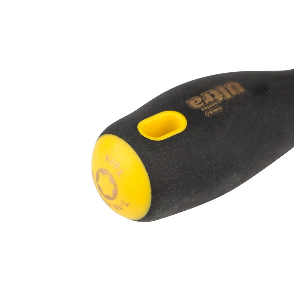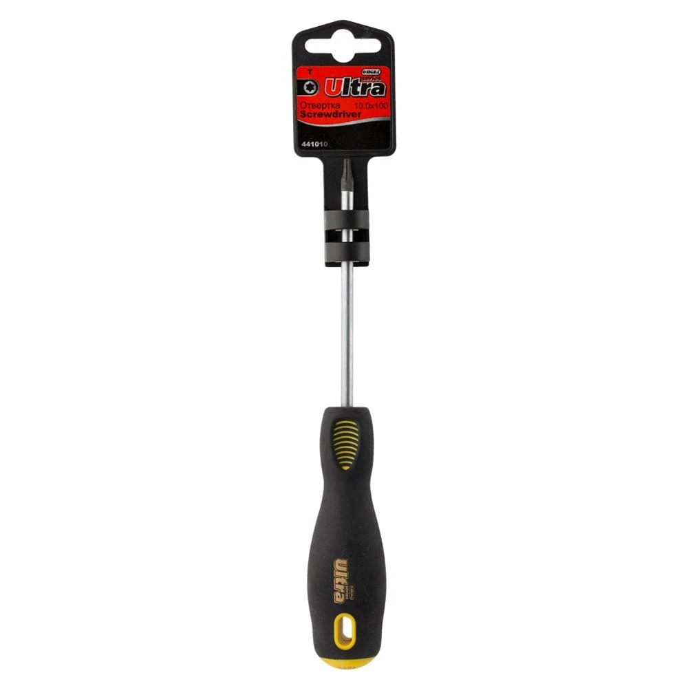 Викрутка шестигранна T10×100мм СrMо ULTRA (4005012) призначена для закручування або відгвинчування різного роду кріпильних з’єднань, що мають шліц TORX. Стрижень виготовлений з хромомолібденової сталі, що забезпечує довгий термін служби інструменту. Має двокомпонентну антиковзаючу рукоятку.